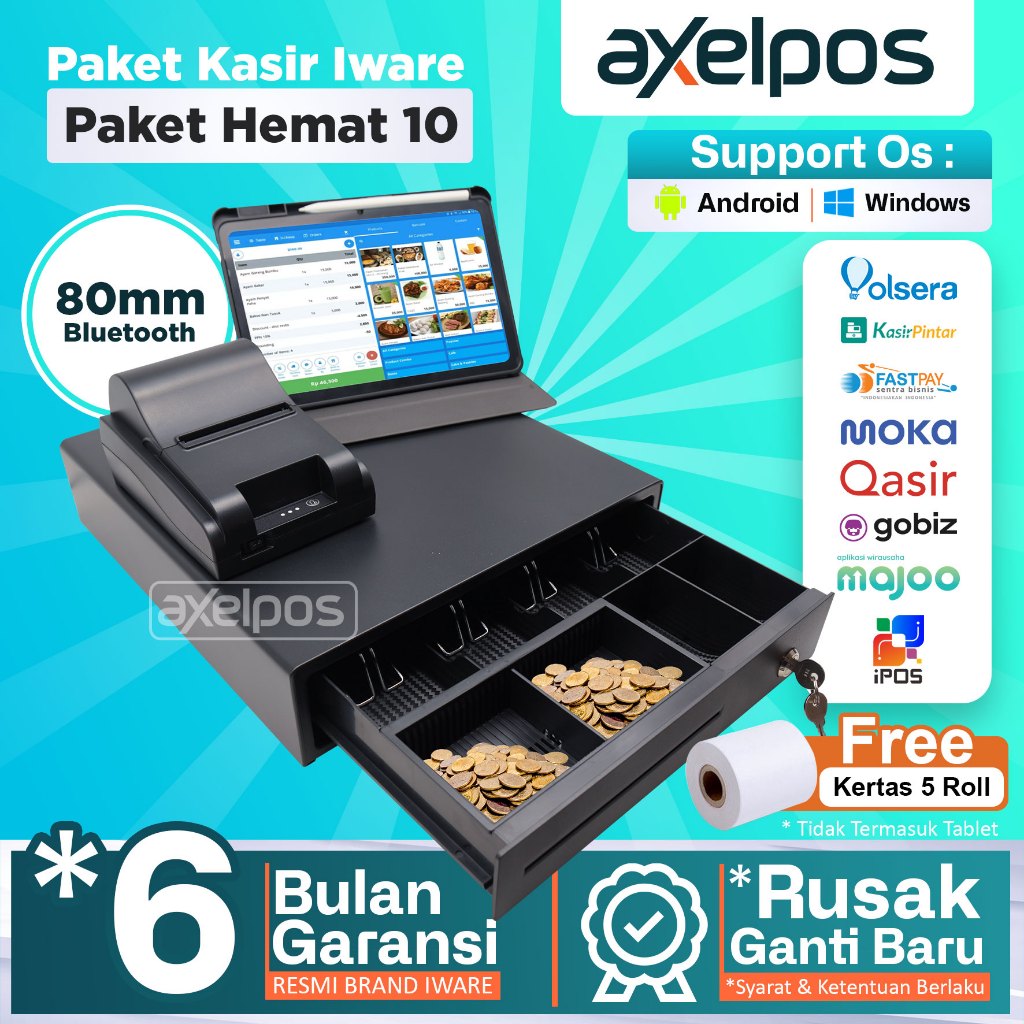 Paket Alat Mesin Kasir Umkm Iware Printer Bluetooth 80mm - Cash Drawer 4 Slot - Free kertas 5 Roll