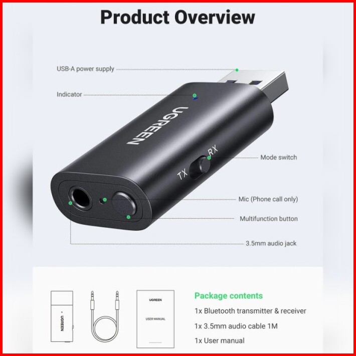 Ugreen Bluetooth Adapter Audio Jack 3.5mm 5.1 Trasmitter Receiver Wireless