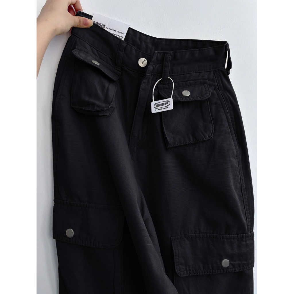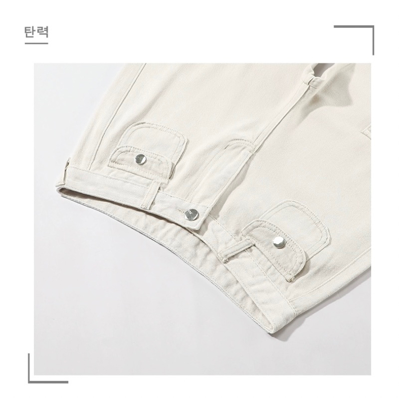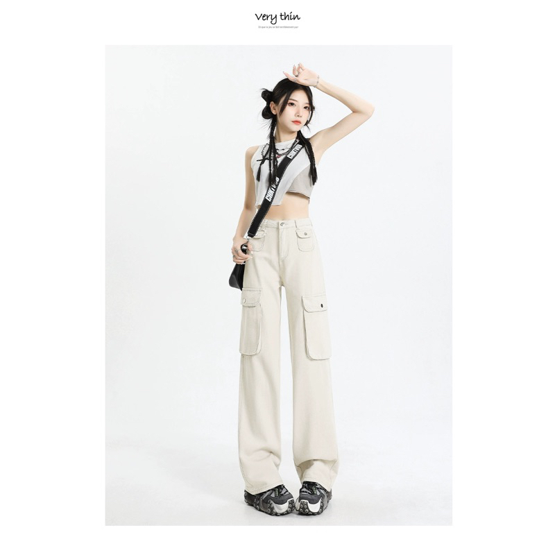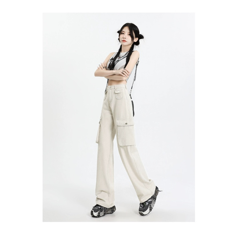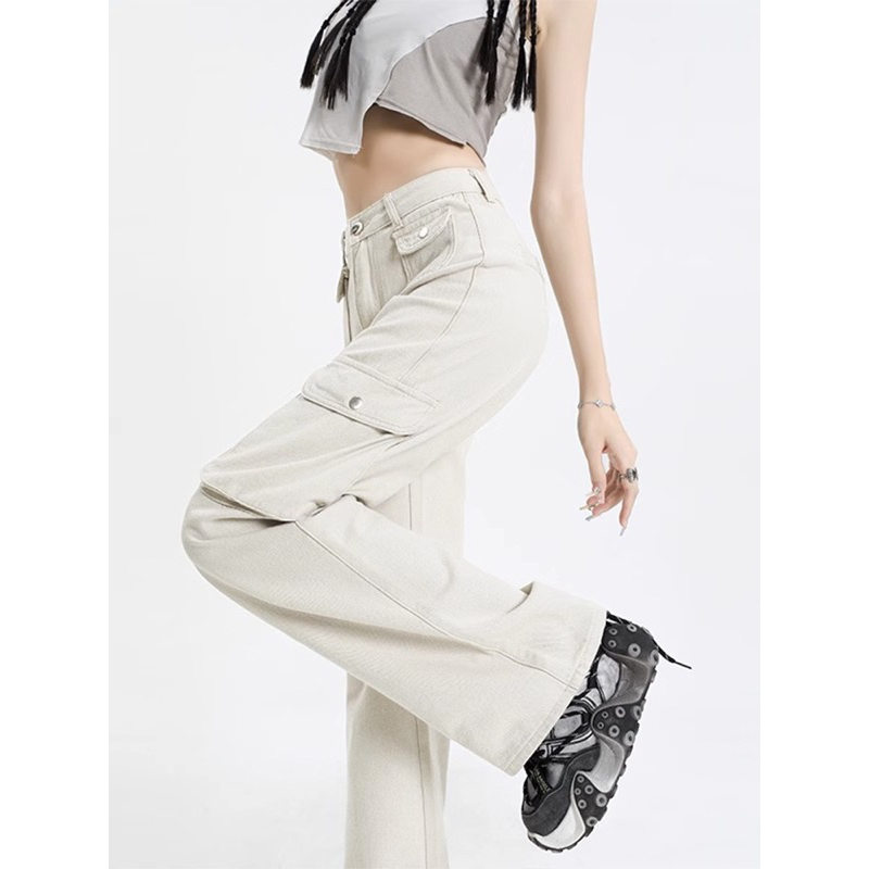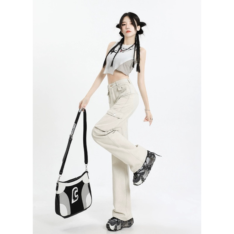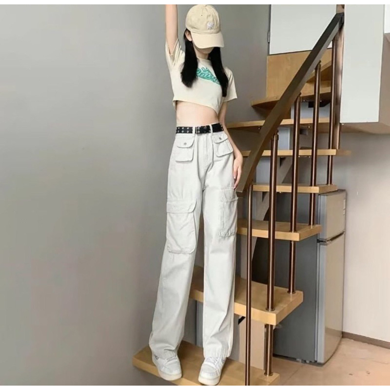 Thirteen - Cargo Denim Pasir Putih Highwaist Loose Celana Jeans Kargo Wanita Korea (realpict)
