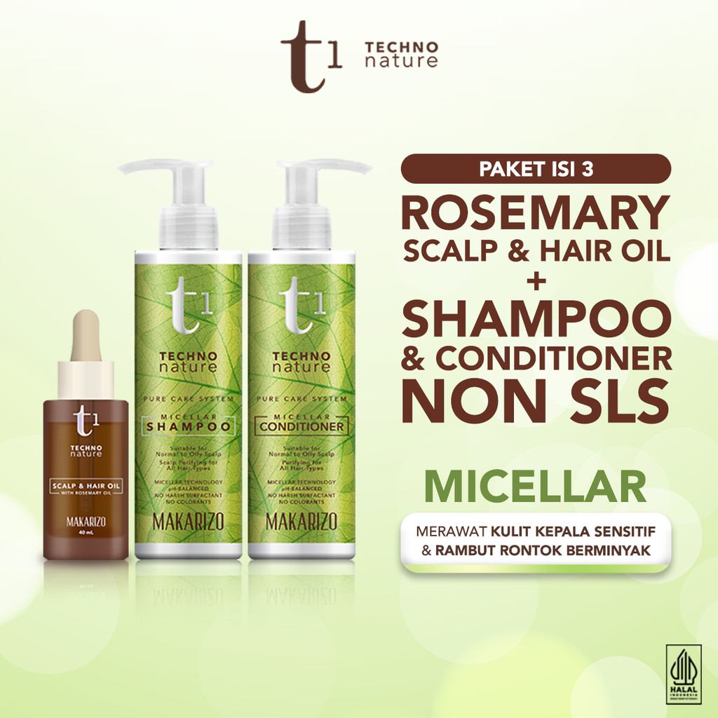 PAKET ISI 3 - MAKARIZO T1 TECHNO NATURE MICELLAR SHAMPOO & CONDITIONER 180 ML + ROSEMARY SCALP & HAIR OIL 40ML
