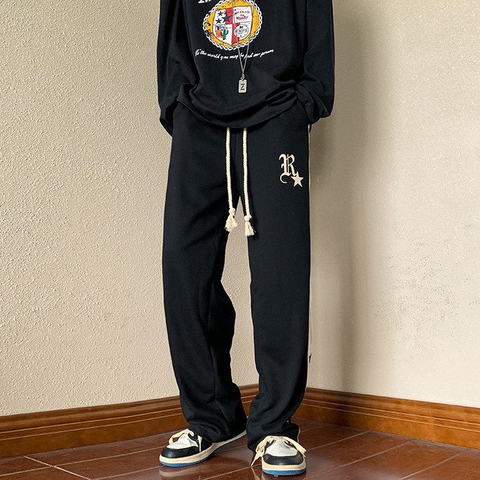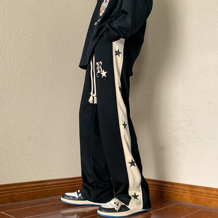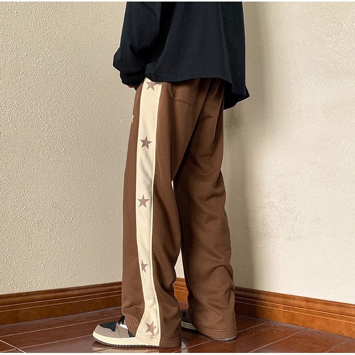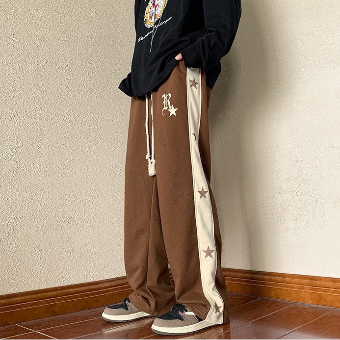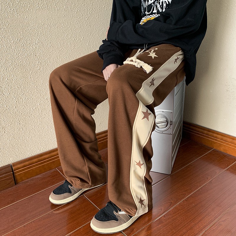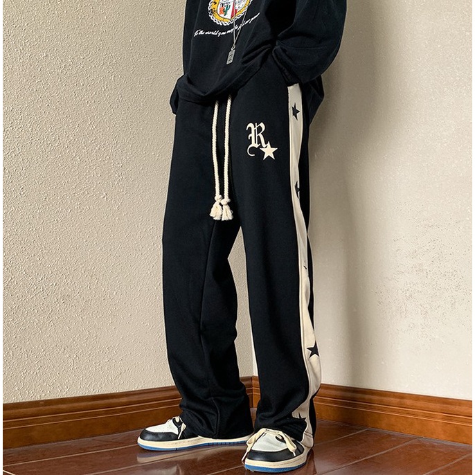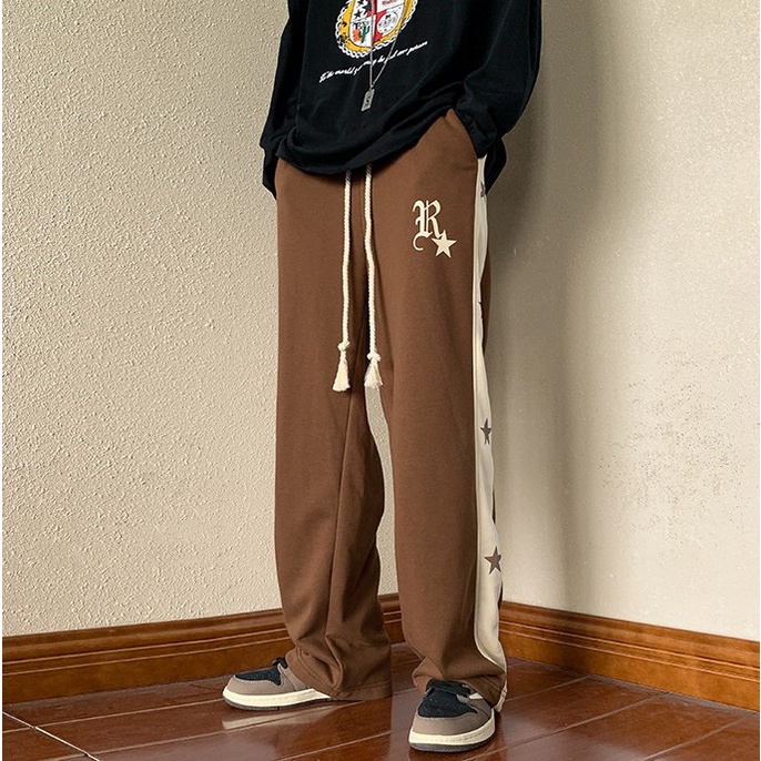 Celana pria splicing celana olahraga pria dan wanita gaya yang sama longgar lurus celana kasual