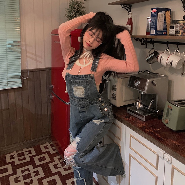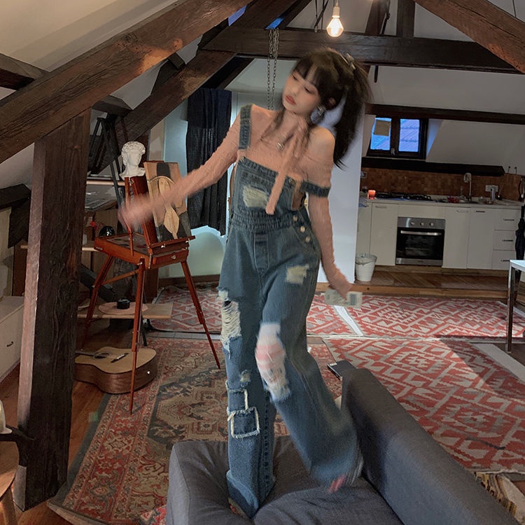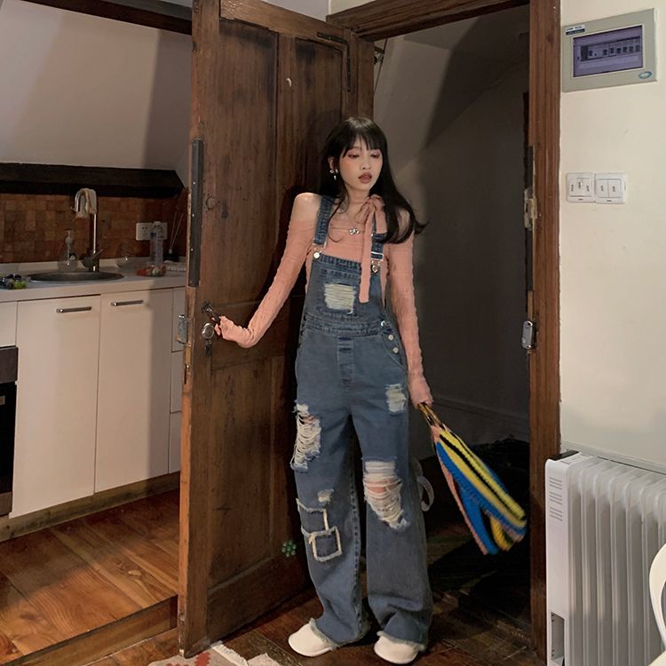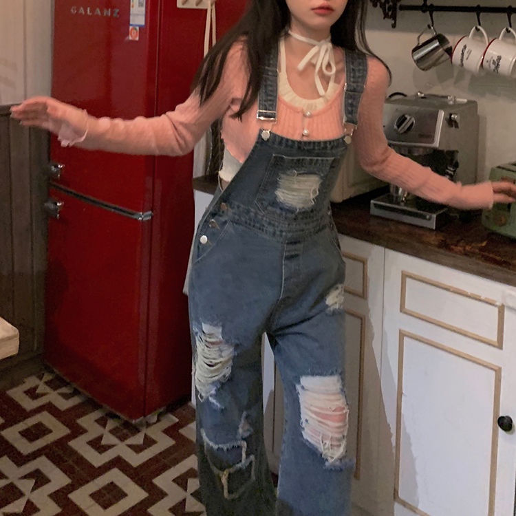 Retro Overall Denim Robek Wanita Pinggang Tinggi Retro Mengepel Celana Lebar Kaki