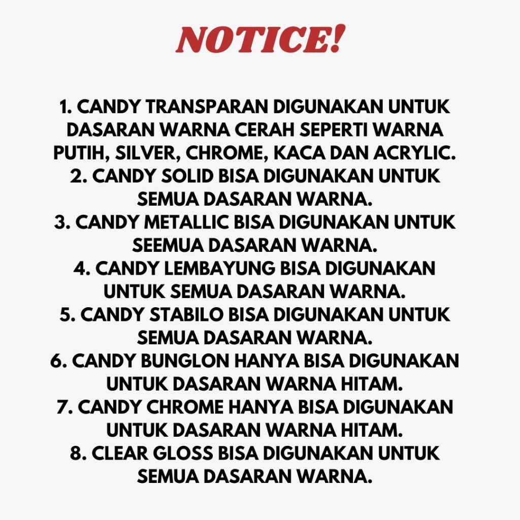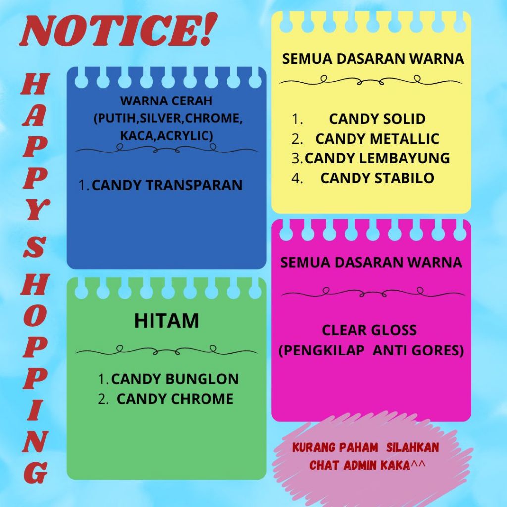 putih solid, hitam glossy solid, pink trans, hijau trans , merah trans, tosca trans, kuning trans , ungu trans, biru trans, orange trans, silver metalic , gold metalic, Instashine , cleaner paint, clear gloss, gold (emas), silver aluminium, kapas oles (1porsi), maroon trans, violink trans, merah solid, kuning solid, hitam doff solid, cup, kuas, busa oles, sepaket alat oles, clear gloss metallic, stabilo red, stabilo yellow, stabilo orange, stabilo orangeyellow, stabilo wishgreen, stabilo blue, stabilo pink , stabilo violet , clear doff, tembaga metallic, biru solid , hitam transparan