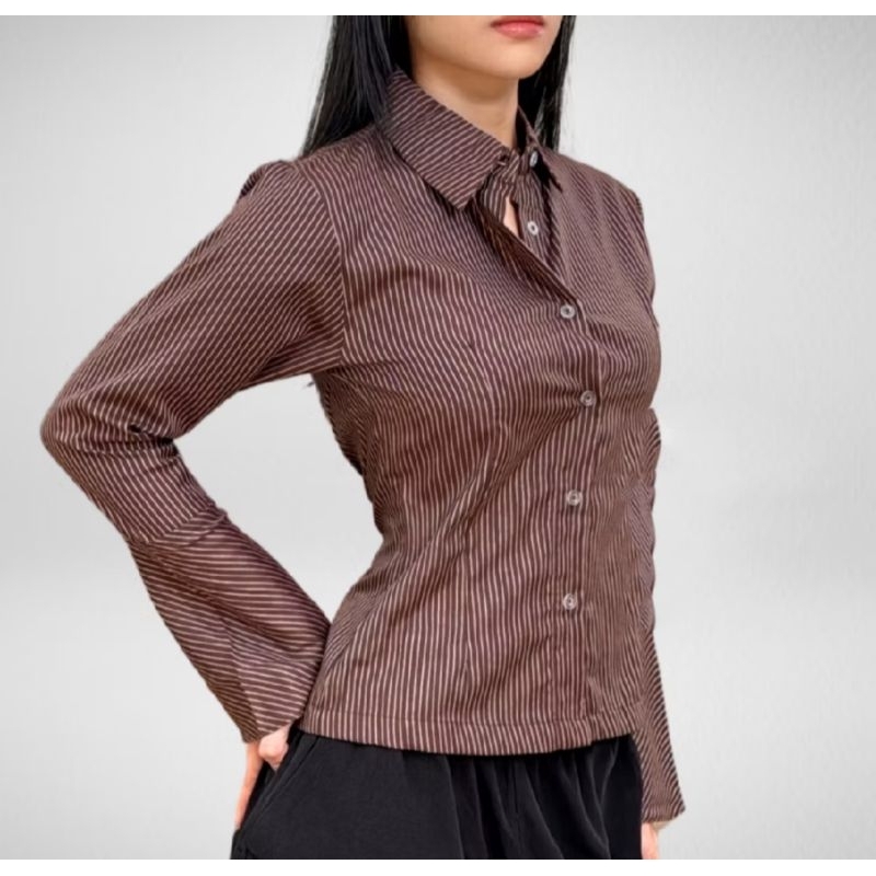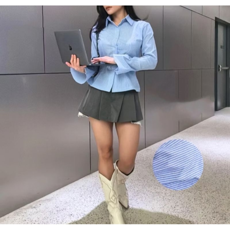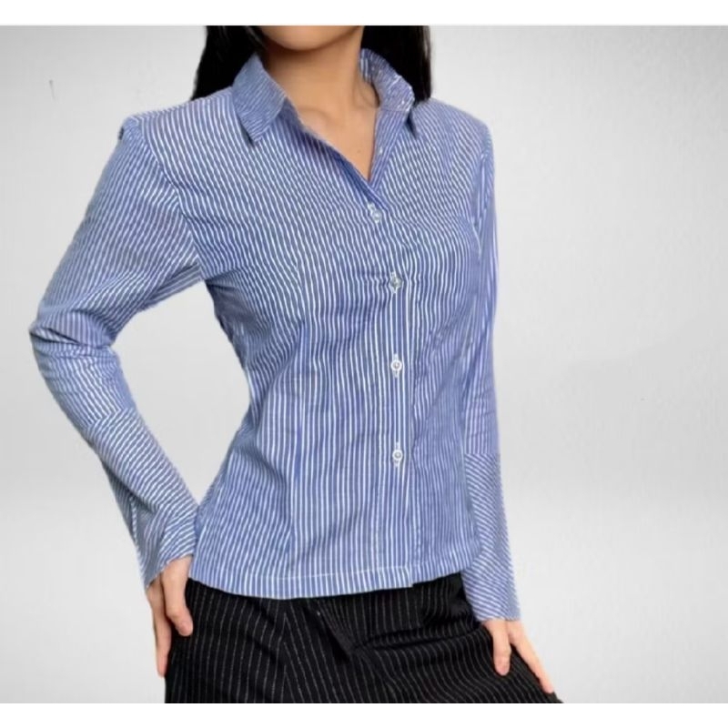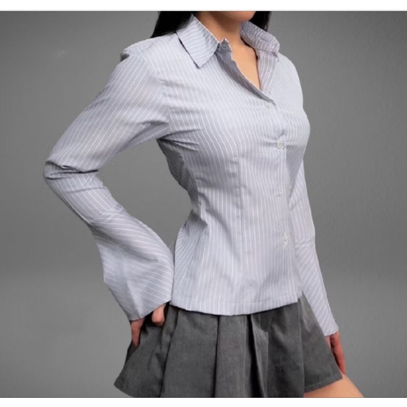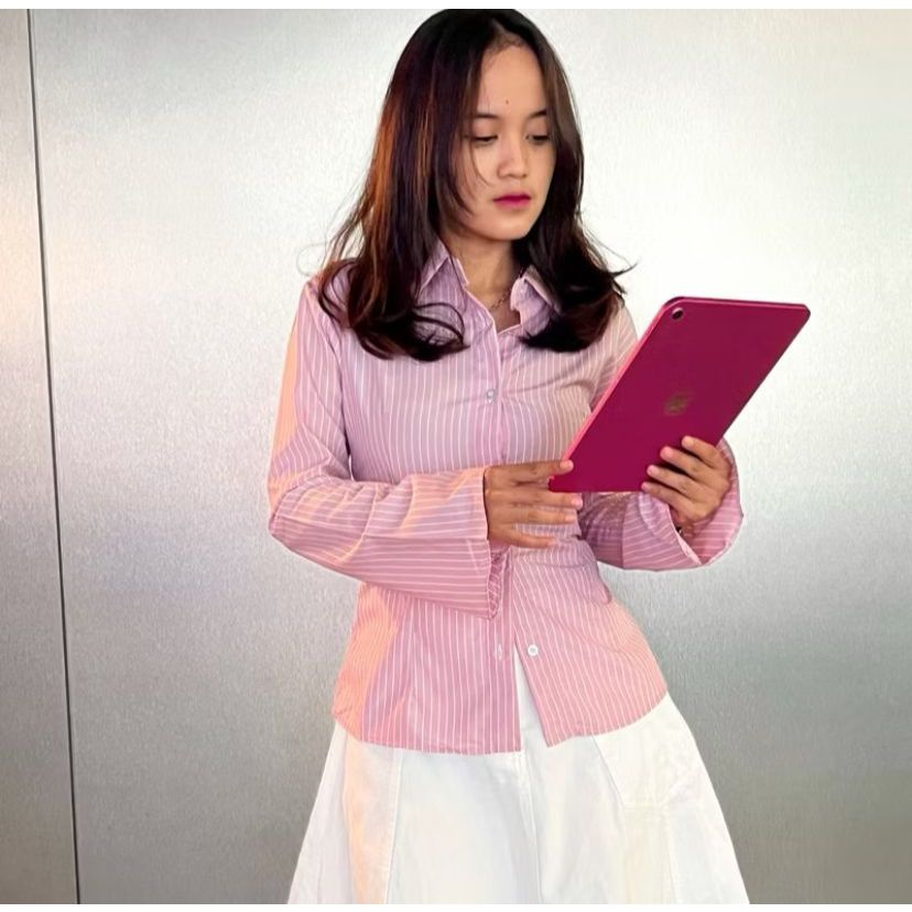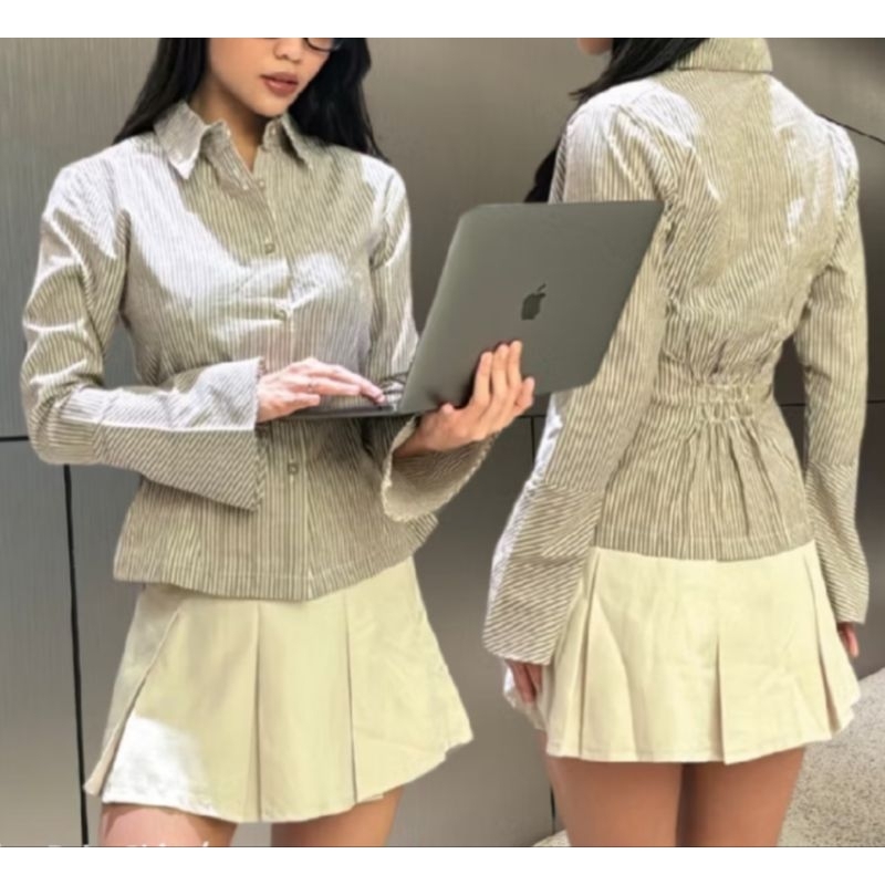 Serena Kemeja Fitted salur Kemeja Korean style kekinian Atasan wanita lengan payung Blous wanita 2025