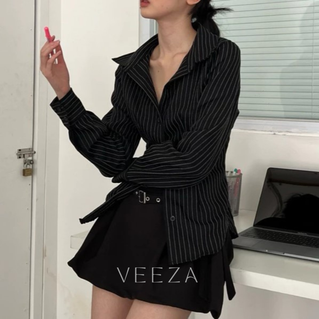 ELTON SHIRT - Kemeja Wanita Garis Garis Kekinian Terbaru Slim Fit Kemeja Kerja Hitam Cewek Korean Lengan Panjang