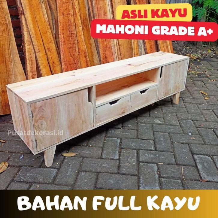 Meja TV Minimalis Kokoh Rak TV Kayu Mahoni Solid Modern Bisa Untuk Televisi 50 Inch Lebih