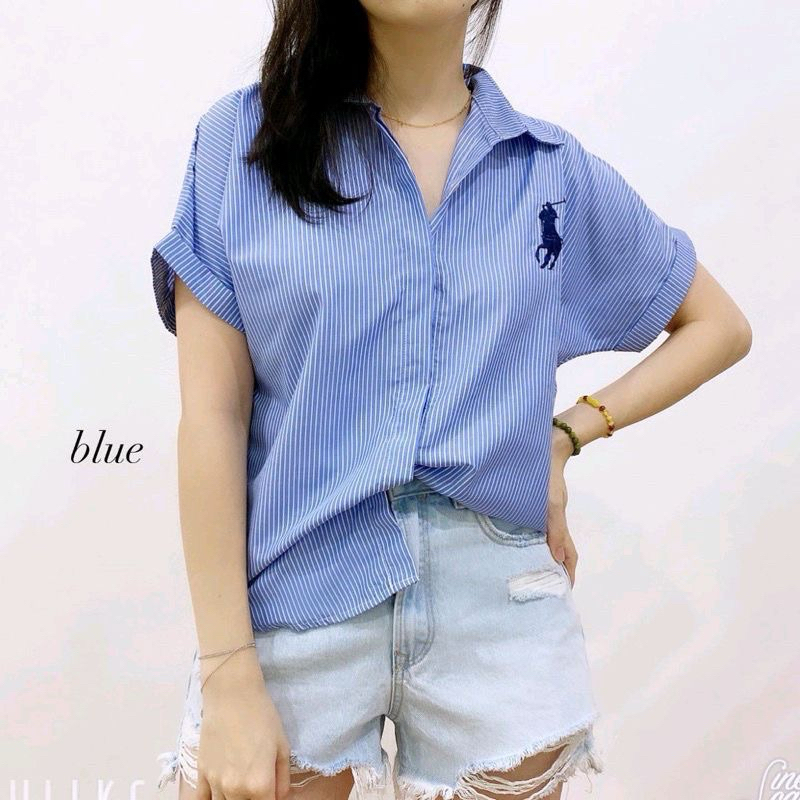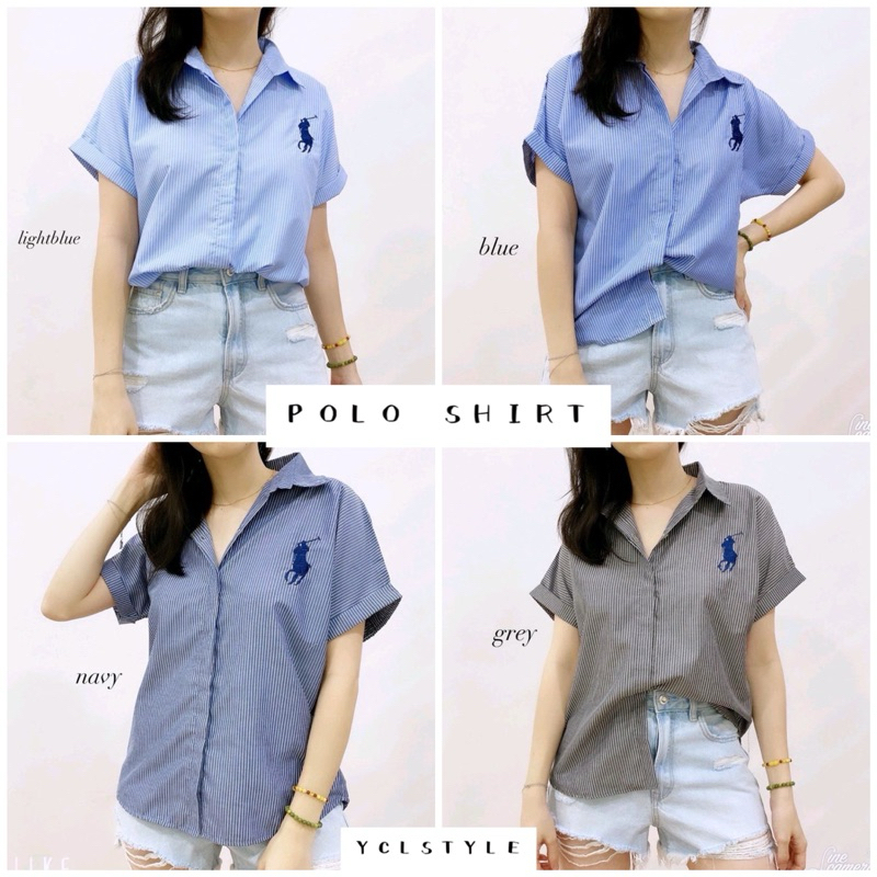 BASIC POLO BORDIR STRIPES SHIRT - KEMEJA SALUR LENGAN PENDEK WANITA KASUAL PREMIUM