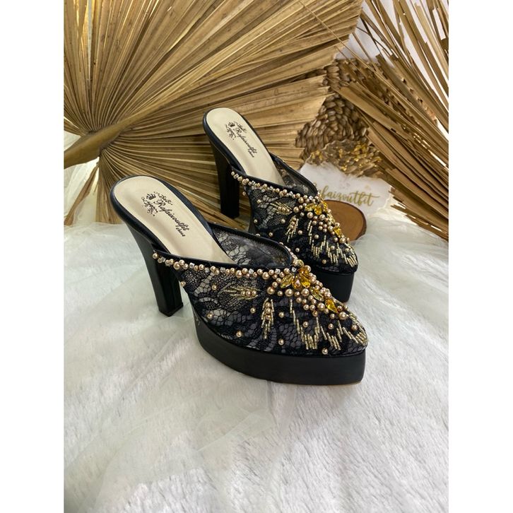 Sepatu Heels Wedding Cantik Alena Hitam Payet Gold 12cm