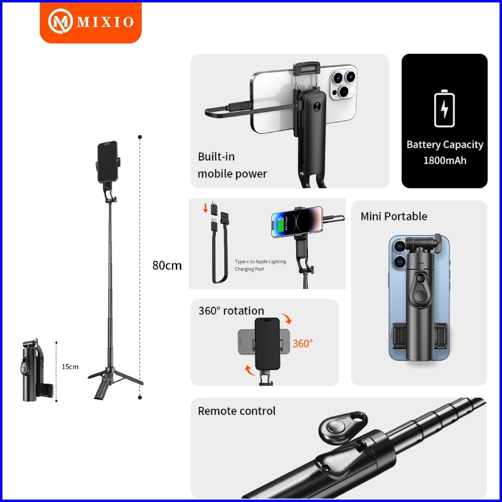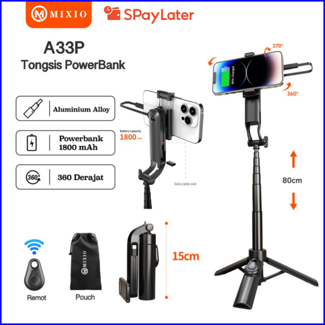 Mixio A33p Tongsis Powerbank Bluetooth Selfie Stick Tripod Mini Aluminium 80cm