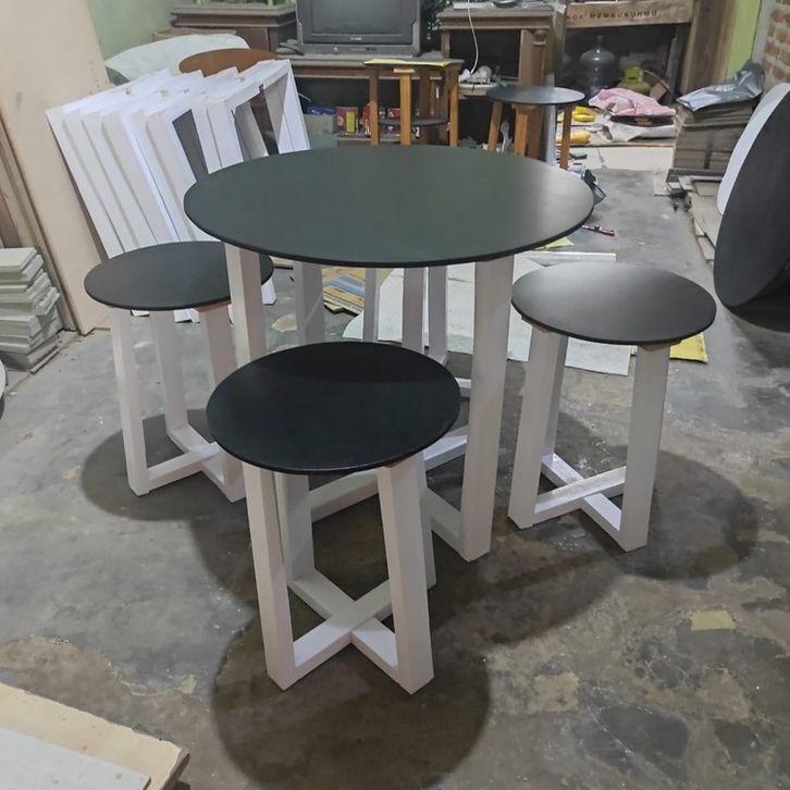 meja cafe minimalis Jumbo Set Minimalis Bulat Aesthetic (1 meja + 4 kursi) Hitam Kaki Putih