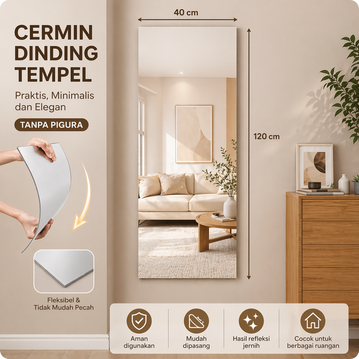 [Mall] Cermin Tempel Dinding DROMMARE Kaca Plastik Tempel Wallpaper Kaca Kamar Mandi Tidur Mirror Polycar 40x120 cm