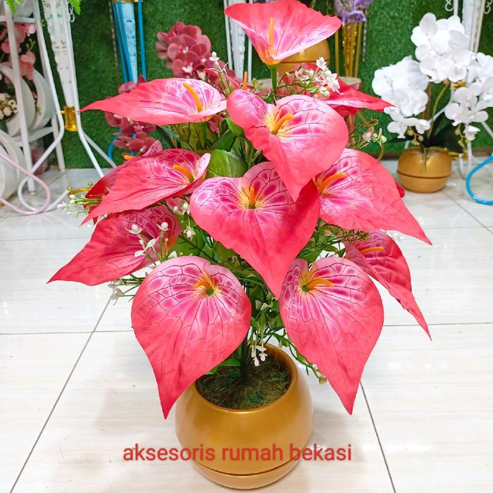 Bunga plastik anthurium Aron panda 18 kuntum bunga dengan pot dekorasi model bola