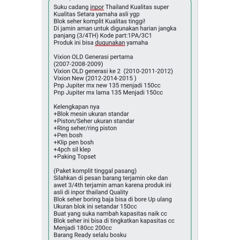 BLOK SEHER KOMPLIT 1PA /3C1+TOPSET CYLINDER YAMAHA VIXION OLD VIXION NEW, PNP MX OLD MX NEW