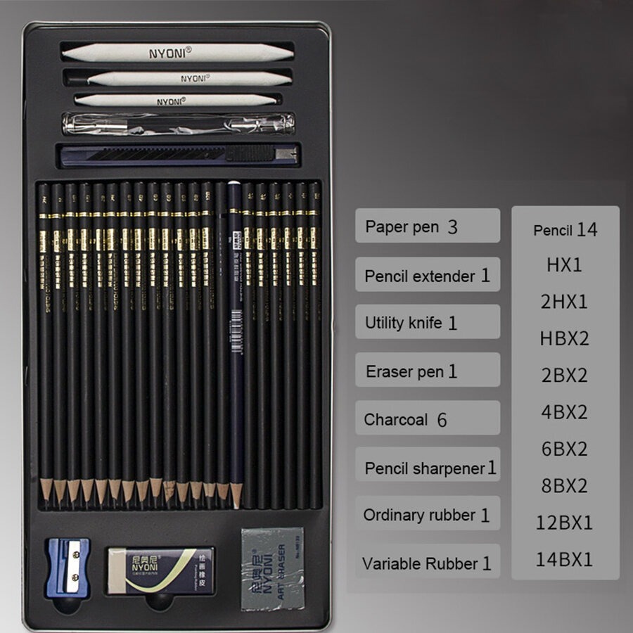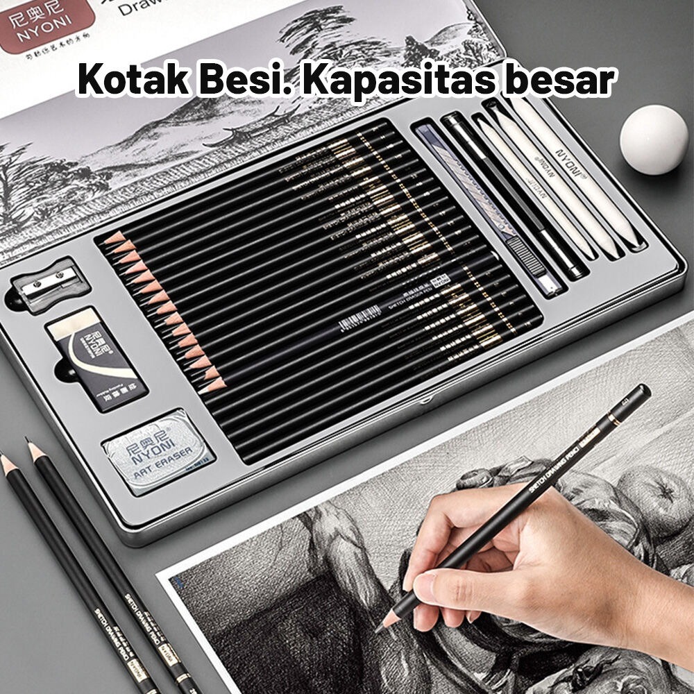 Nyoni Sketch Drawing Pencil / Pensil Grafit Charcoal Arang 29 Pcs Set Tin Case