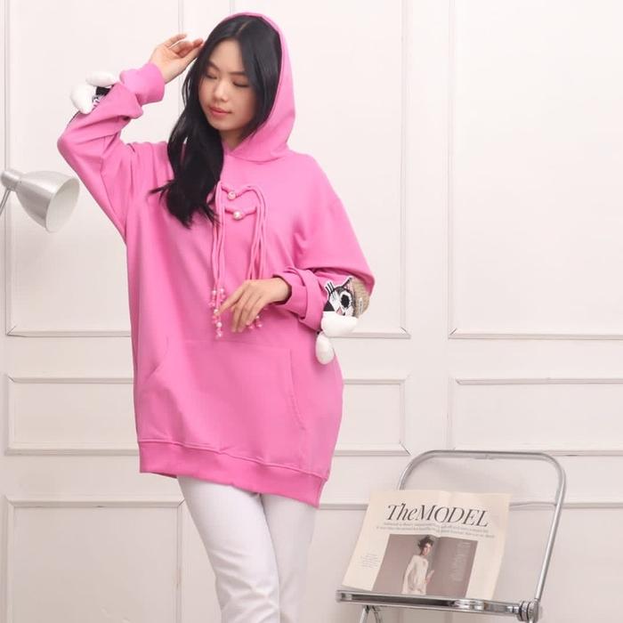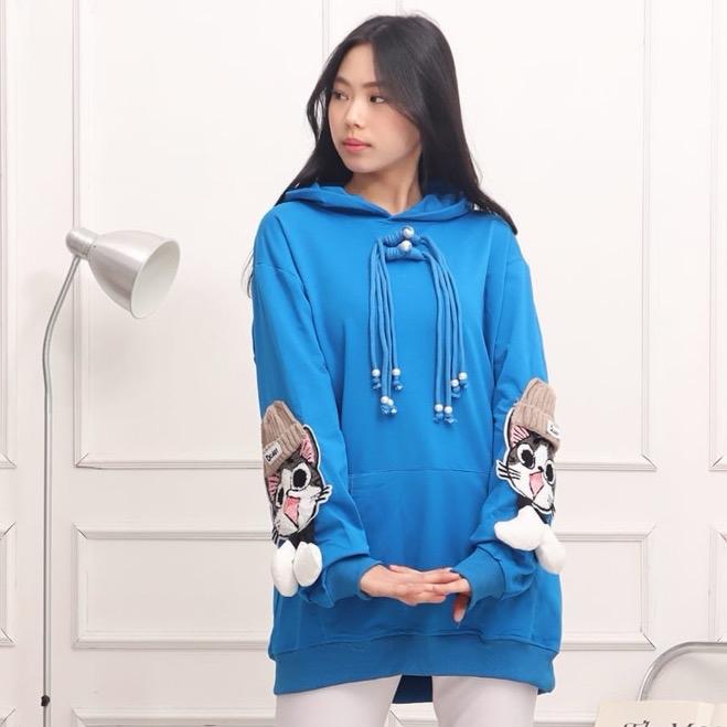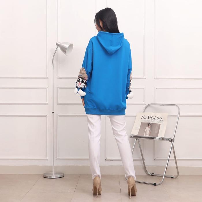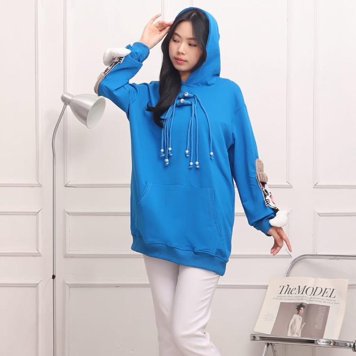 SWEATER HOODIE KOREAN STYLE PREMIUM APLIKASI BONEKA TIMBUL BAJU MOTIF WANITA PANJANG TANGAN OVERSIZE JAKET CROP - A BIRU TOPI, OVERSIZE