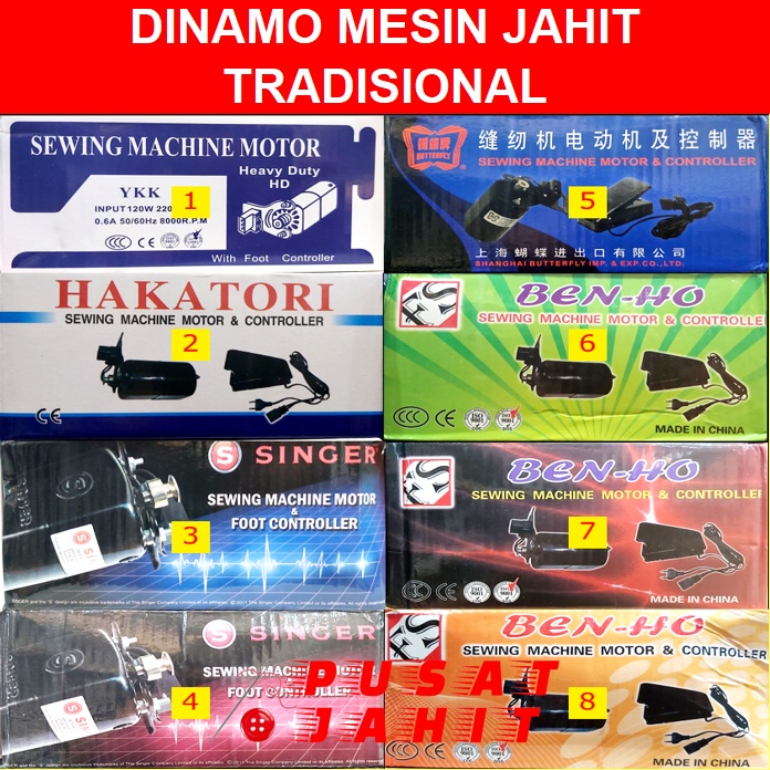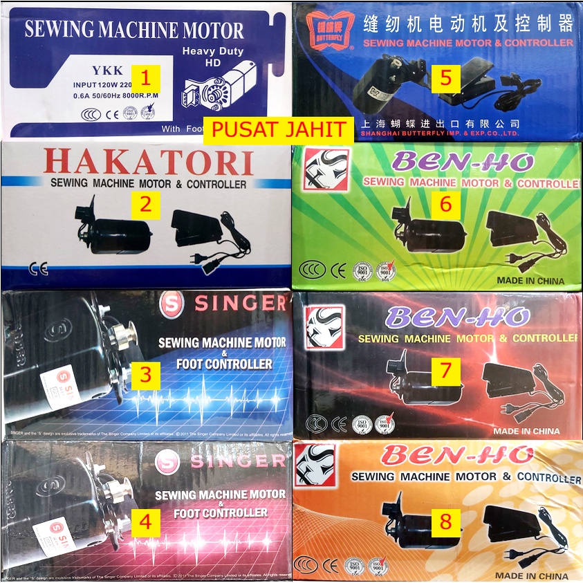 1. YKK 120 W, 2. HAKATORI 100 W, 3. SINGER 100 W, 4. SINGER 150 W, 5. BUTTERFLY 120 W, 6. FSTRONG 100 W, 7. FSTRONG 120 W, 8. FSTRONG 150 W, 9. PUTAR TERBALIK
