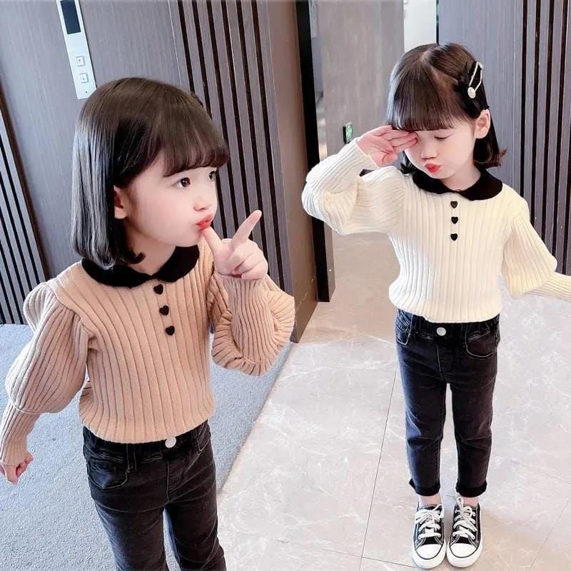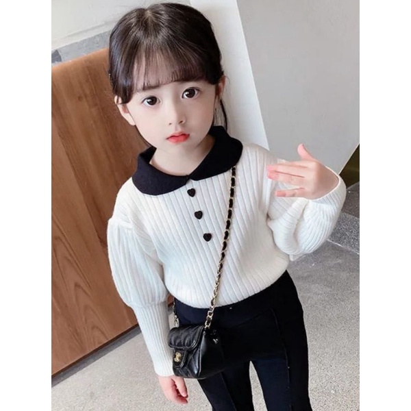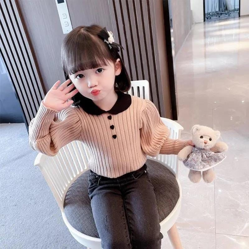 Kaos Berkerah Tangan Panjang Anak Cewek Korean Style / Atasan Baju Bahan Kaos Knit Usia 2-7 Tahun Import
