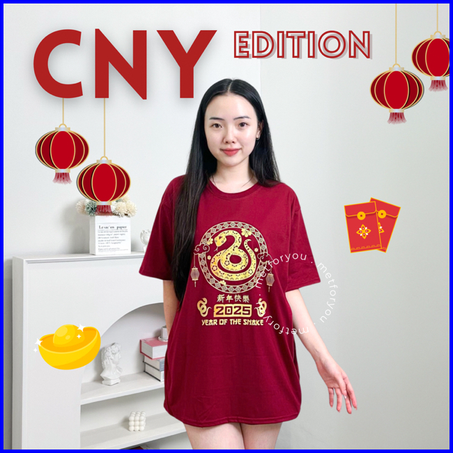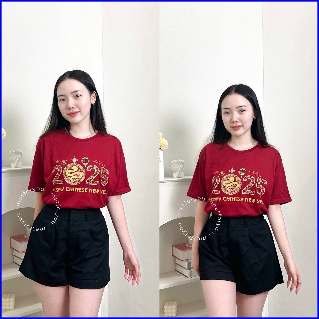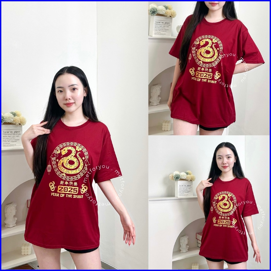 Metforyou Baju Kaos Chinese New Year 2025 Imlek Unisex Wanita Oversize Jumbo Dewasa Lengan Pendek
