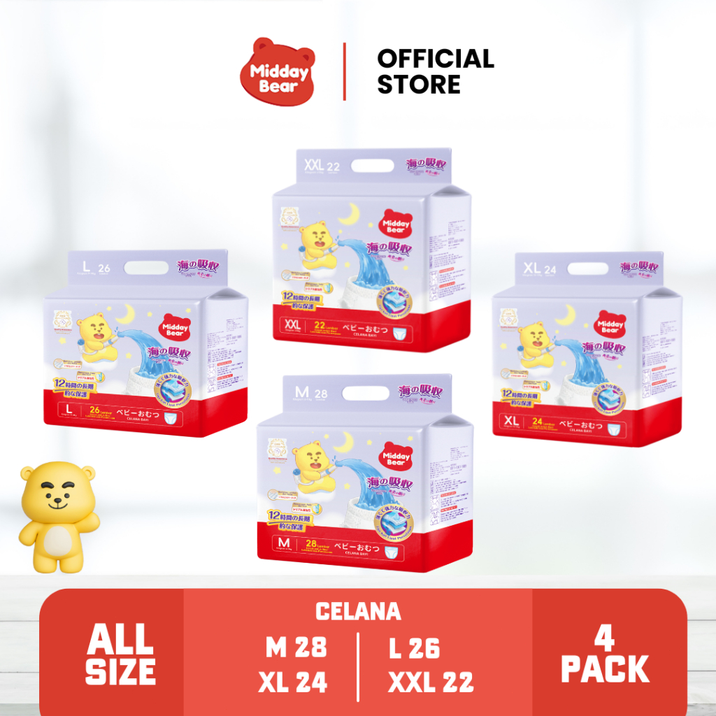 4 PACK MIDDAY BEAR SEA POPOK CELANA BAYI PULL-UP PANTS SEKALI PAKAI DAYA SERAP EXTRA NIGHT PANTS