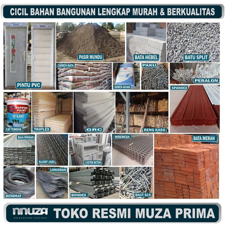 PINTU BAJA MP2 90X210 PTH, PINTU PVC STNDR, PINTU PVC MDL 1, Besi beton 10 mm/LMBAR, Besi beton 6mm/LMBAR, Besi beton 8mm/LMBAR, Pasir Bangka (1 Kijang), Bata Ringan 7.5cm 10cm (1 kubik), Bata Ringan (1 kubik), Besi Sloop jadi 3m, Besi Sloop jadi 4m, Spandek Pasir 2m, Spandek Pasir 4m , Spandek Pasir 5m , BAJRING 0,55MM , BAJRING 0,60MM , BAJRING 0,75MM, PASRI MUNDU 1 KIJANG, KASO 4X6 isi 6 btng, Semen acian 40kg, Semen 3 roda (50kg), Semen 3 roda (40kg), Kawat Bendrat 1 ikat, GLASS BLOCK KUANTRUM , GLASS BLOCK DIAMOND , GLASS BLOCK OCEAN, TRIPLEK 12 MM , TRIPLEK 8 MM , TRIPLEK 4 MM , GRC BOARD 120CMx240CM, CAT TEMBOK 4.5KG, BESI WIREMESH COR M5 FULL , BESI WIREMESH COR M8 FULL, BATU CORAL 1 KIJANG, BATA MERAH 5 KUBIK, ALAS COR BONDEX 0,65 MM, BATA HEBEL 10cm 4 KUBIK, spandex pasir 3 meter , spandex pasir 4 meter , spandex pasir 5 meter , spandex pasir 6 meter, pasir 1 ENGKEL