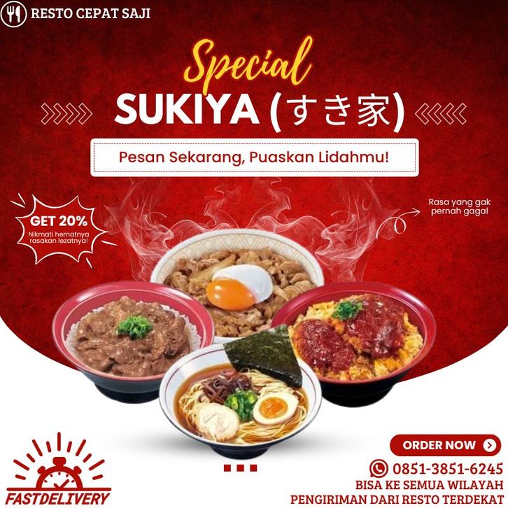 Paket Puas 1, Paket Puas 2, Paket Puas 3, Paket Puas 4, Paket Puas 5, Paket Family A, Paket Family B, Caramel Pudding, Tori Paitan Ramen, Beef Tori Paitan Ramen, Chashu Tori Paitan Ramen, Jakarta Tori Paitan Ramen, Jakarta Beef Tori Paitan Ramen, Jakarta Chashu Tori Paitan Ramen, Gyudon, Half Boiled Egg Gyudon, Jakarta Gyudon, Crispy Chili Oil Gyudon, Kimchi Gyudon, Korean Style Spring Onion Gyudon, Melty Cheese Gyudon, Double Half Boiled Egg Gyudon, Beef Yakiniku Bowl, Half Boiled Egg Yakiniku Bowl, Jakarta Yakiniku Bowl, Crispy Chili Oil Yakiniku Bowl, Kimchi Yakiniku Bowl, Korean Style Spring Onion Yakiniku Bowl, Melty Cheese Yakiniku Bowl, Double Half Boiled Egg Yakiniku Bowl, Chicken Shoyu Ramen, Beef Shoyu Ramen, Chicken Chashu Ramen, Jakarta Ramen, Jakarta Beef Ramen, Half Boiled Egg Beef Egg Bowl, Half Boiled Egg Chicken Katsu Egg Bowl, Red Hot Sauce Beef Egg Bowl, Red Hot Sauce Chicken Katsu Egg Bowl, Chicken Katsu Egg Bowl, Beef Egg Bowl, Japanese Curry Rice, Curry With Beef, Chicken Katsu Curry, Deluxe Curry, Red Hot Curry With Beef, Red Hot Curry With Chicken Katsu, Karaage Curry, Beef Bowl Kids Meal, Kids Ramen Plate, Kids Curry Plate, Oishii Spicy Karaage, Oishii Karaage, Chikuwa, Shrimp Gyoza, Beef Plate Only, Beef Yakiniku Only, Chicken Katsu 2pcs, Miso Soup, Half Boiled Egg, Rice, Oishii Tartar Karaage, Lemon Squash, Blue Lemon Squash, Matcha Latte, Milk Tea Latte, Homemade Iced Tea, Mineral Water, Eco Bag Sukiya