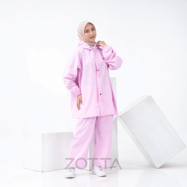 Jas Hujan Wanita Pink Pastel Lucu Aesthetic Stelan Celana ZOTTA
