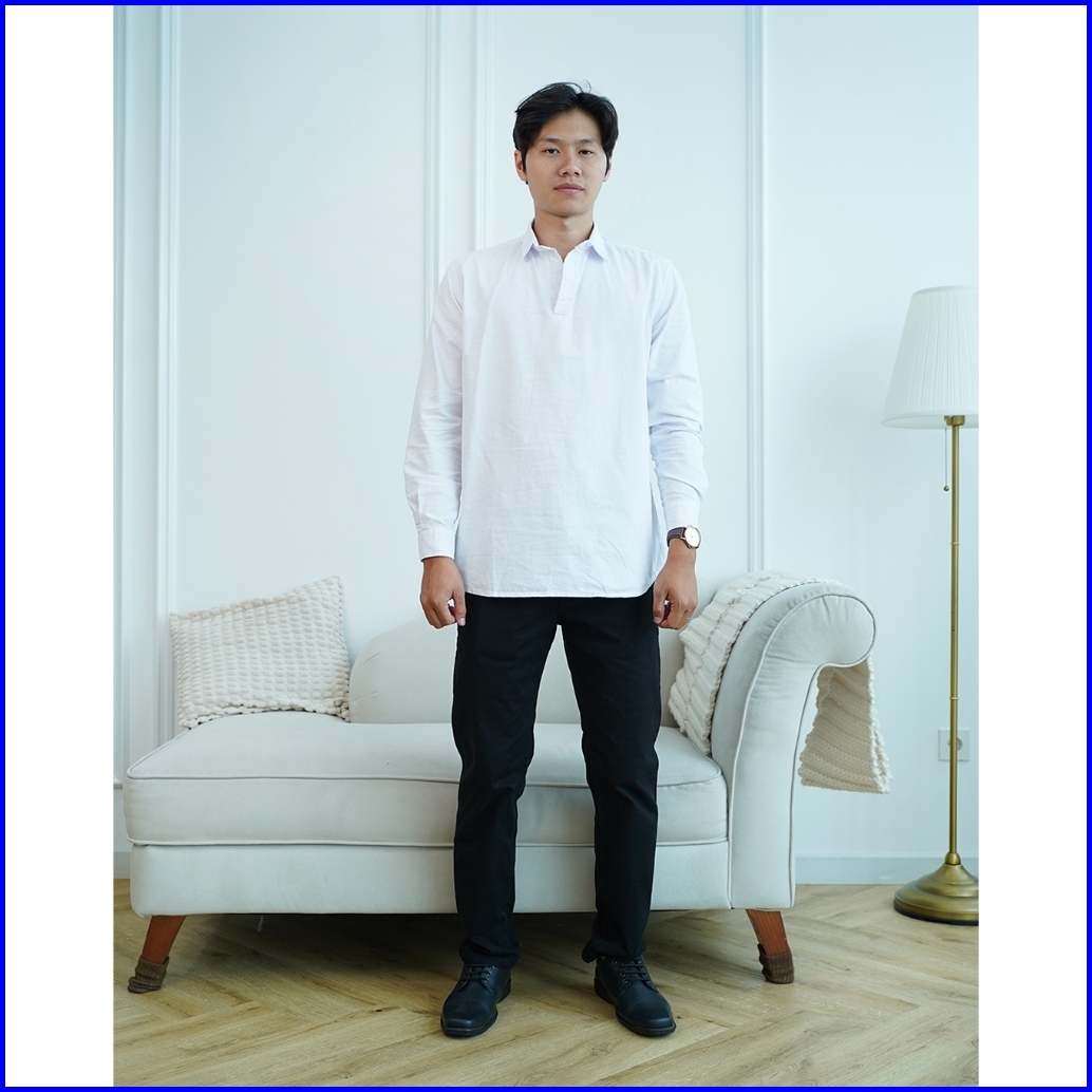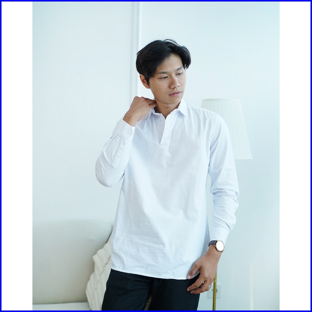 Kemeja Polos Pria Lengan Panjang Korean Style Kerah V Neck Putih