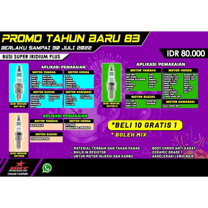 BEAT SCOOPY VARIO, FU OLD FI GSX, JUPITER HEAD STD, KAZE ATHLETE BLITZ, KIRANA KARISMA BLADE, LEGENDA SUPRA X FIT, MIO J FINO NOUVO, MIO KARBU SOUL GT, MX OLD MX KING XSR, NGK 2T NINJA B9ECS, NGK 2T RXKING BPR7, NGK RX KING BP7HS, NMAX AEROX LEXI, PCX ADV CB150, SCORPIO, SHOGUN 110 125, SMASH ARASHI, SPIN SKYWAVE NEXT, SUPRA X 125 SPACY, THUNDER 250, TIGER HEAD BRT, VEGA R CRYPTON, VIXION R15 WR155, WING PRIMA GRAND, X RIDE / MIO M3, XABRE MT15 R25, ZX135 KLX150 TRACKER