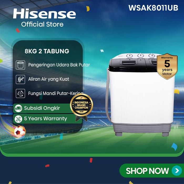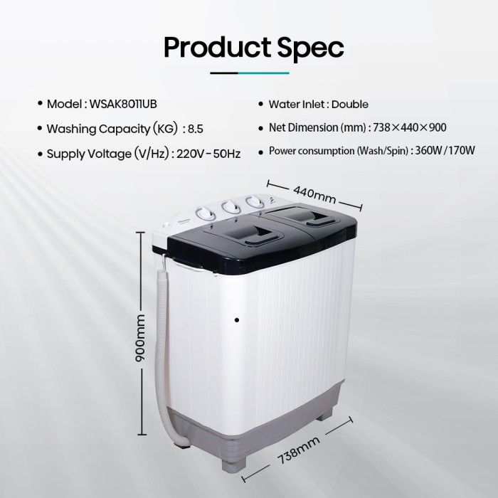 HISENSE-WSAK8011UB-Mesin Cuci Kapasitas TWINTUB 8KG-MesinCuci Bukaan Atas-Pengeringan Udara Bak Putar