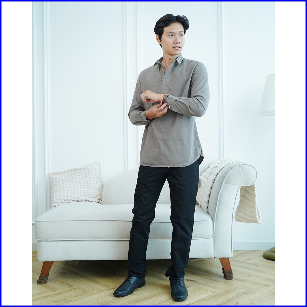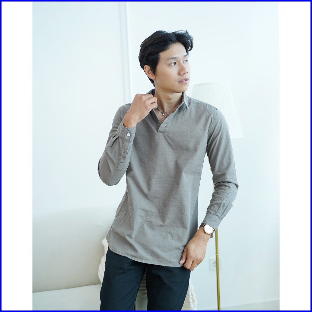 Kemeja Polos Pria Lengan Panjang Korean Style Kerah V Neck Grey