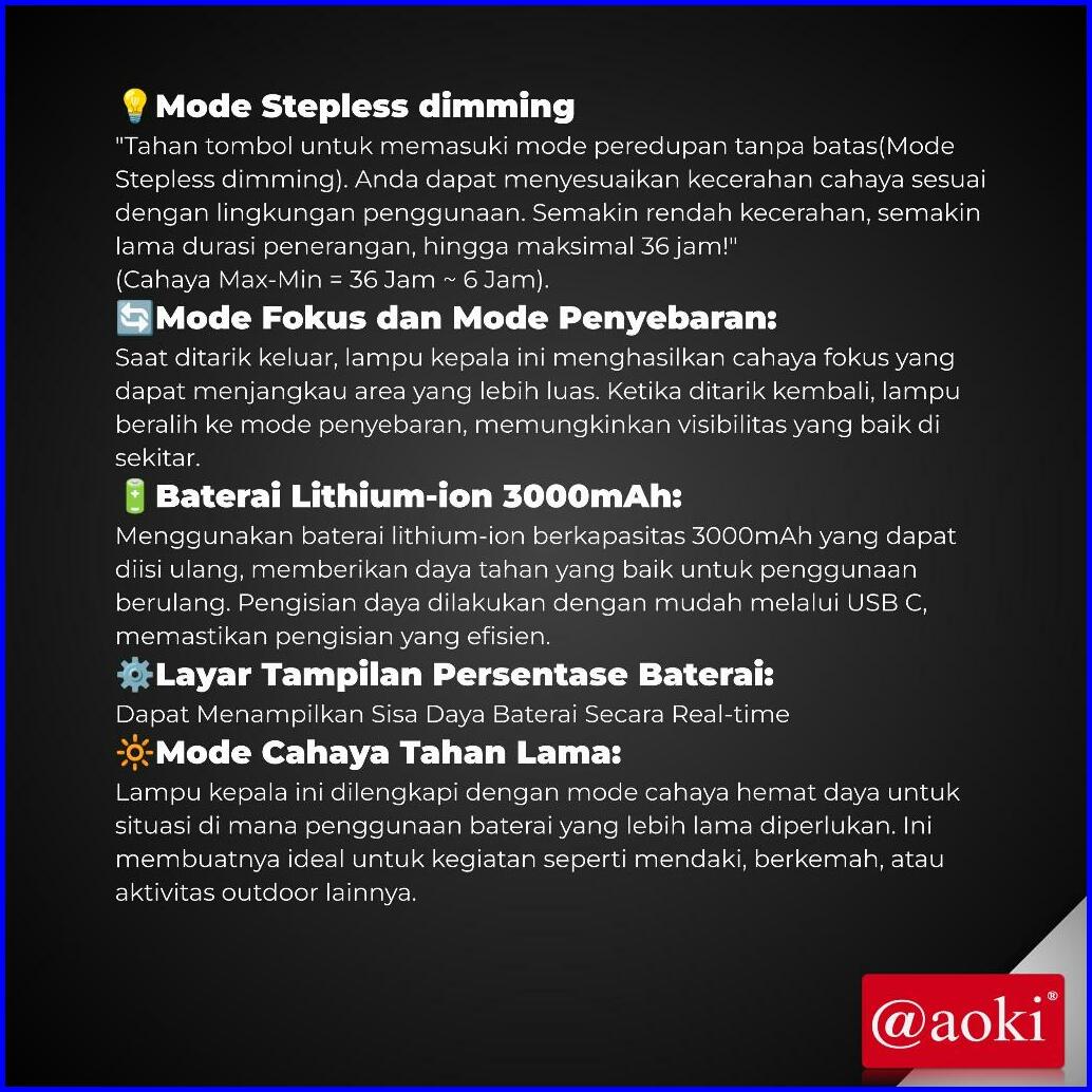 Aoki Senter Kepala Zoom Smartbright Stepless Dimming Usb-c Layar Persentase Baterai Outdoor Ideal