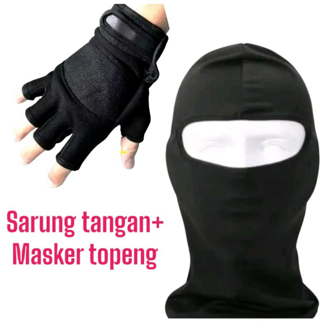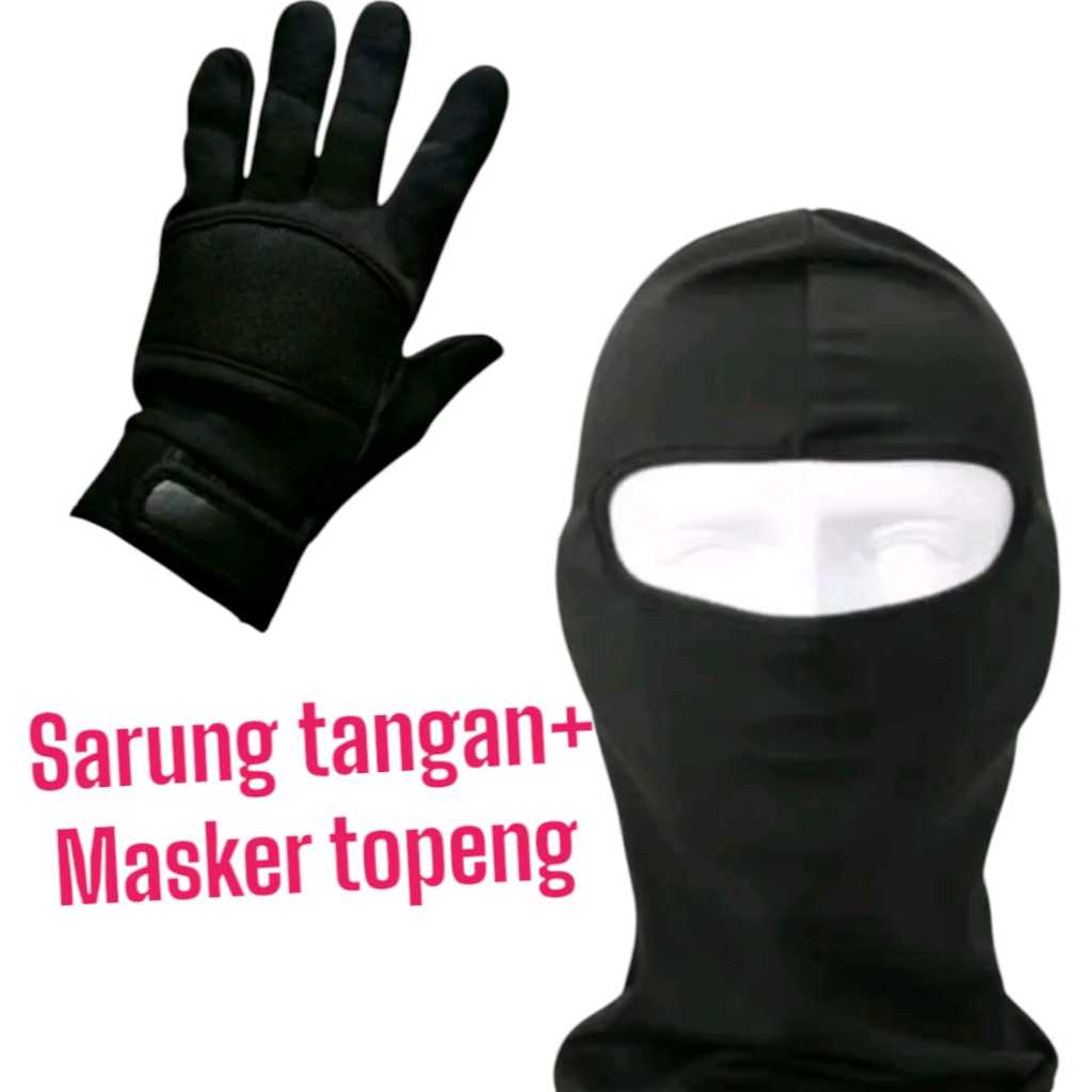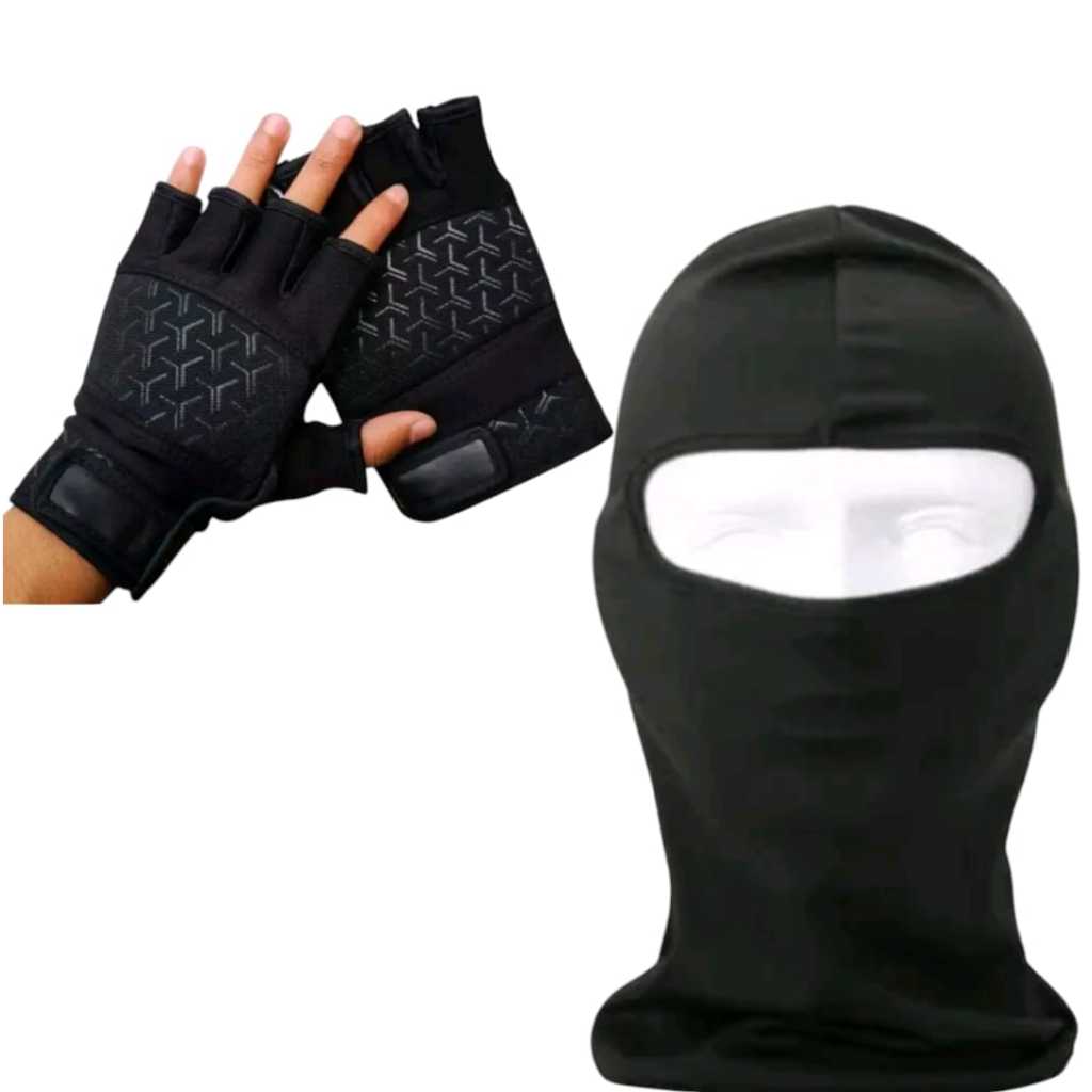 PAKET MOTORAN SARUNG TANGAN DAN MASKER TOPENG BALACLAVA HITAM POLOS PRIA DEWASA