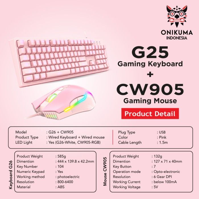 ONIKUMA G25 + CW905 Pink Gaming Keyboard Mouse Set