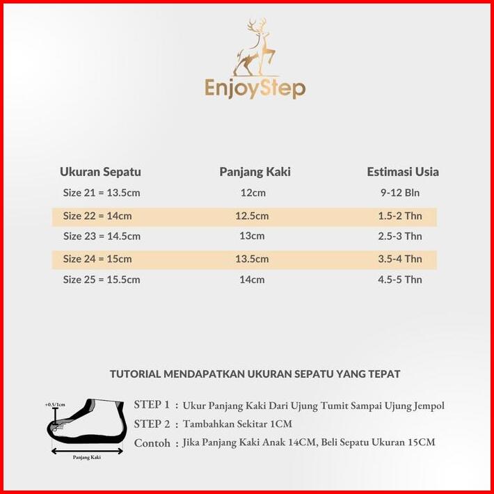SIZE 21 = 13.5 CM, SIZE 22 = 14 CM, SIZE 23 = 14.5 CM, SIZE 24 = 15 CM, SIZE 25 = 15.5 CM
