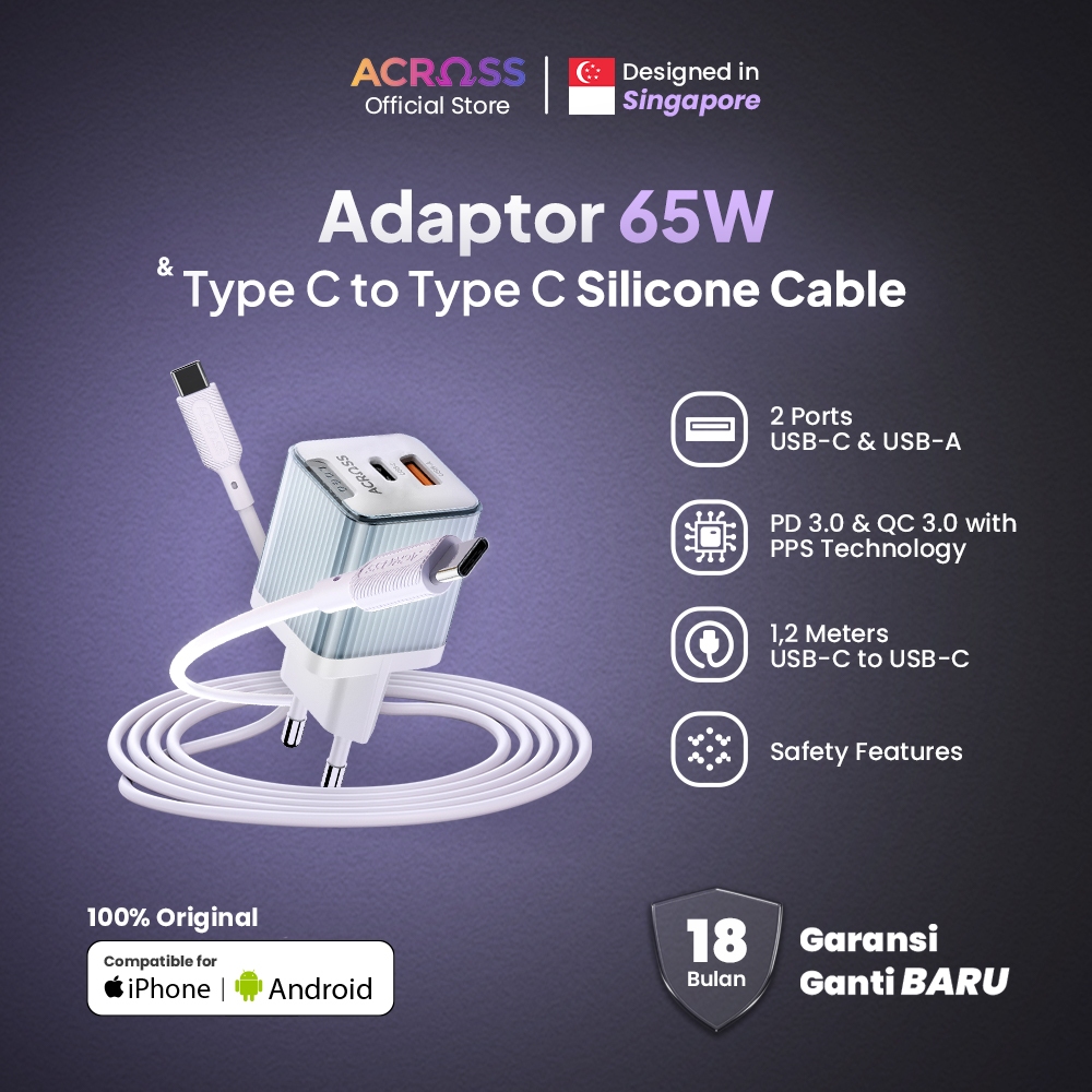 Across 45W 18W Fast Charging Adaptor Charger iPhone & Android 2 Port Type C + USB PD QC 3.0 PPS - Pastel Blue
