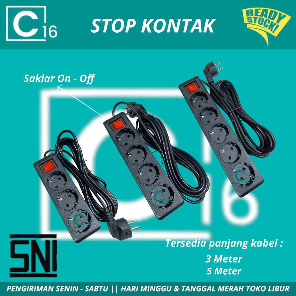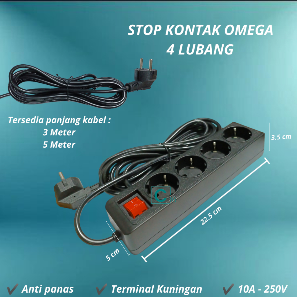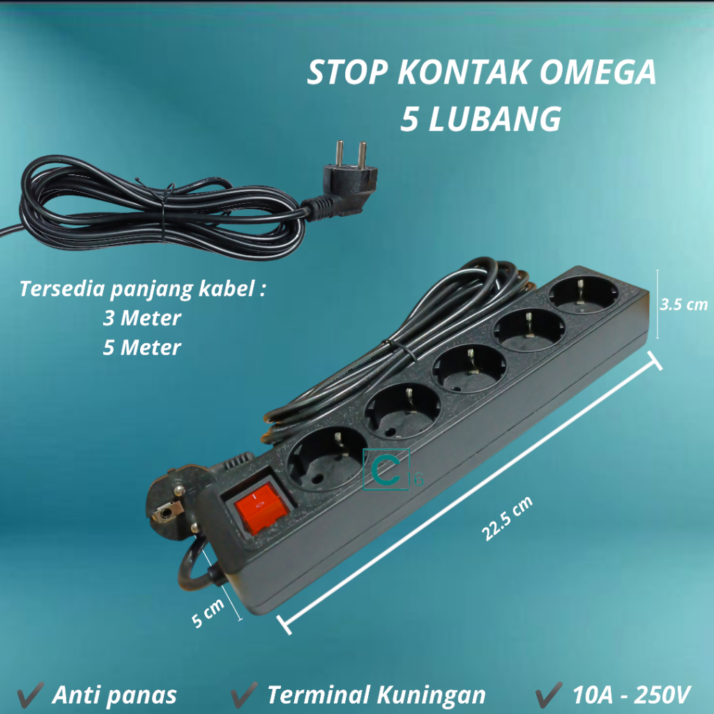 Stop Kontak + Kabel OMEGA HITAM 3/4/5 Lubang 3/5 Meter Asli Kuningan SNI Berkualitas