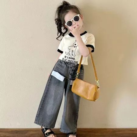 KOREA STYLE ONE SET ANAK PEREMPUAN CUTE PRINT T-SIRT LENGAN PENDEK+CELANA JEANS COOL KANTUNG BESAR CELANA JEANS KULOT