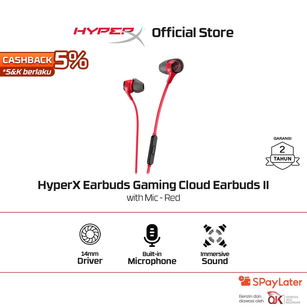 HyperX Earbuds Gaming Cloud II - Red Wired Noise Cancelling Stereo Bass Android iOS Non Bluetooth Non Wireless Led RGB Microphone Promo Cicilan Ringan