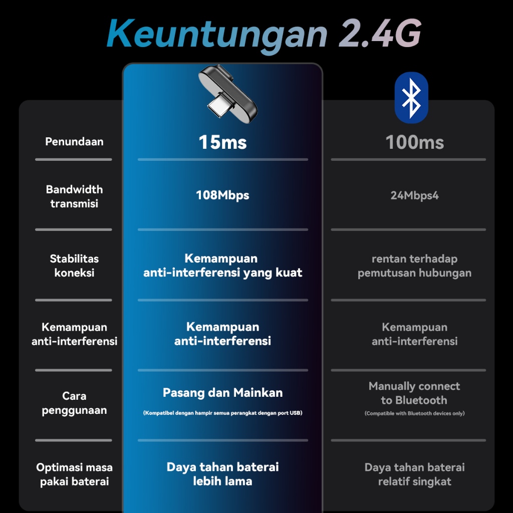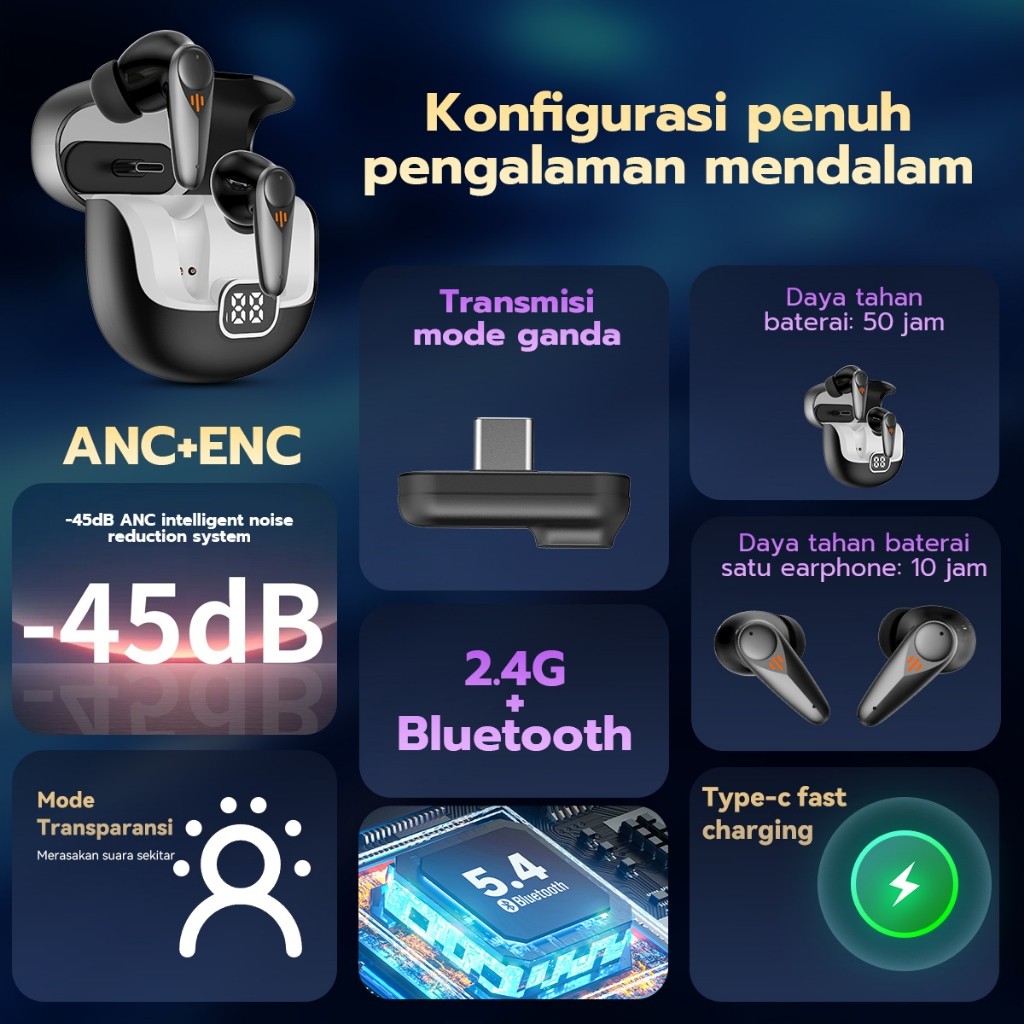 Headset Earphone Bluetooth 5.4 and USB 2.4G Zero Latency TWS Hi-Res Audio