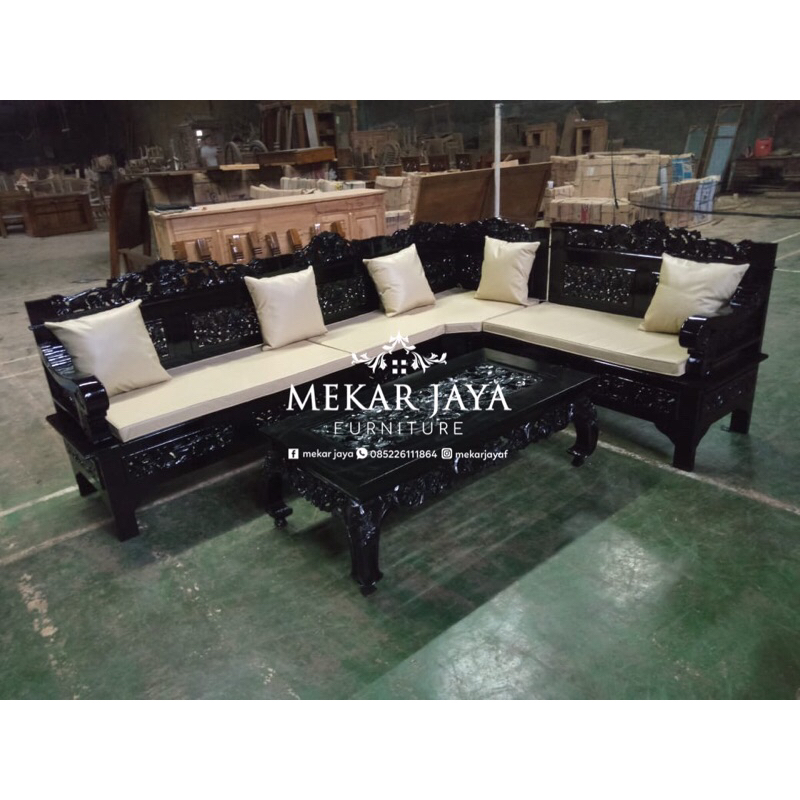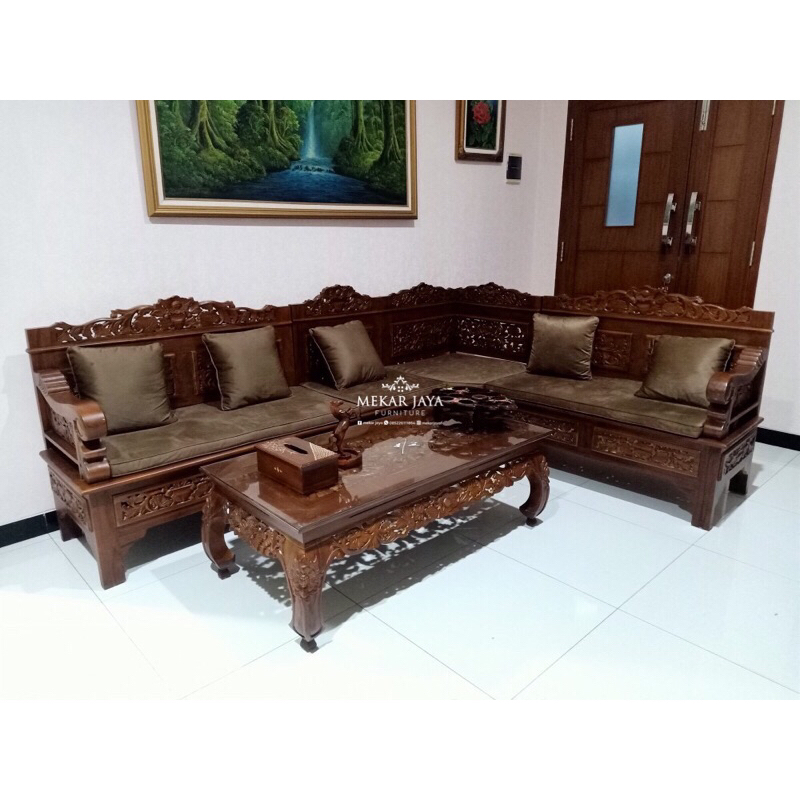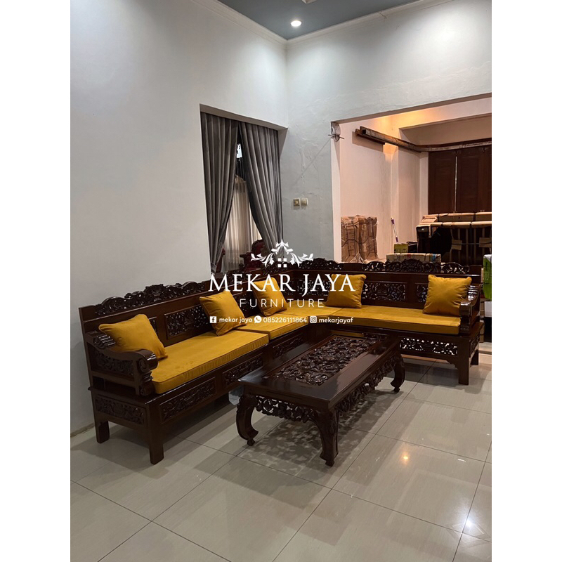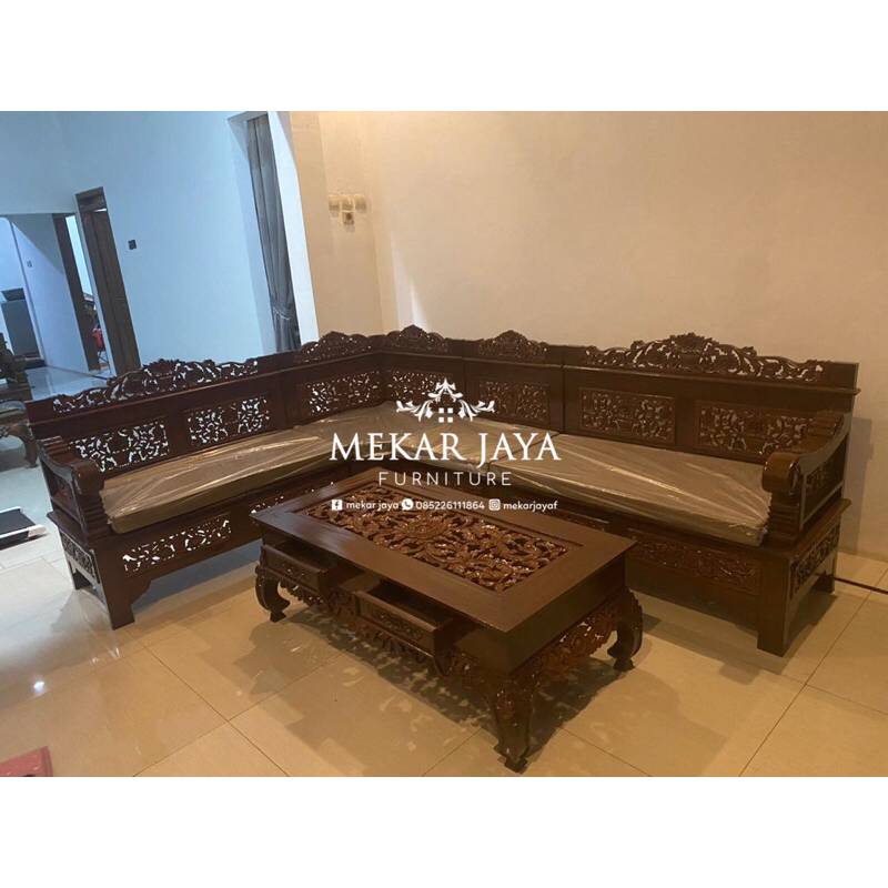 SET KURSI SOFA RUANG TAMU SUDUT BAGONG UKIR KRAWANG JATI MINIMALIS FURNITURE JEPARA
