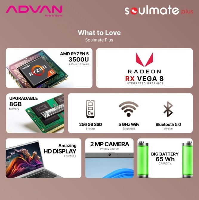 Laptop Advan Soulmate Plus Ryzen 5 Ram 8Gb 256Gb Ssd Windows