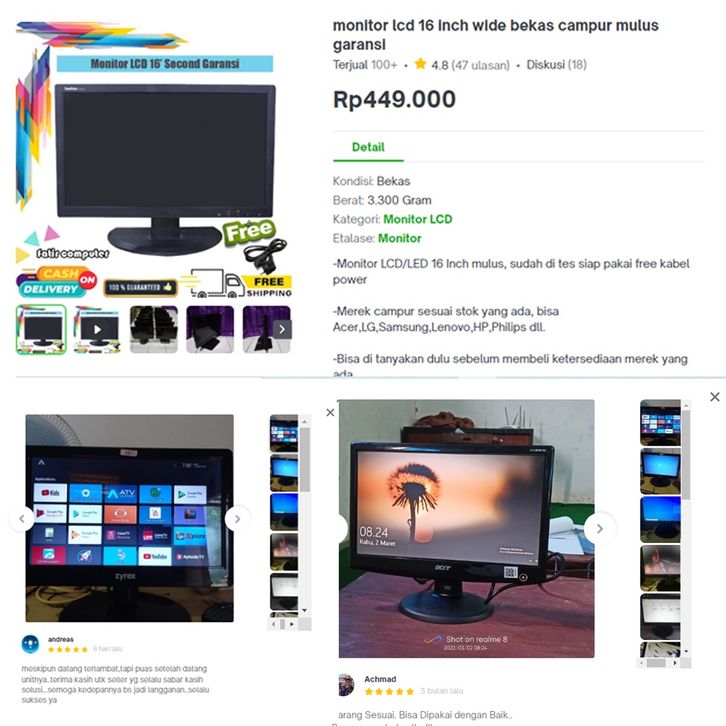 TANPA DP LED LCD Monitor PC Komputer Dekstop CCTV 16 Inch Wide Merek Campur Normal no minus Garansi Free Kabel Power