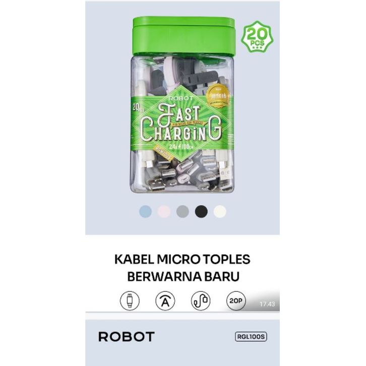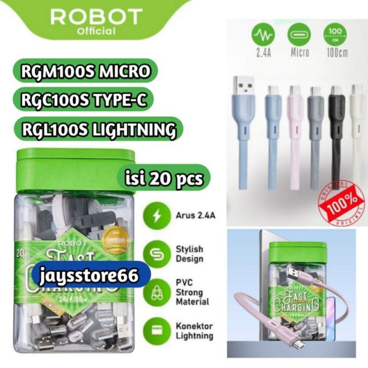 1 TOPLES 20 PCS KABEL DATA ROBOT RGM100/MICRO & RGC100 TYPE-C & RGL100IPHON RGM100S RGC100S RGL100S NEW