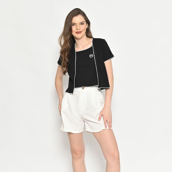 MURAH QUEENTIN Tanktop Cardigan Wanita Crop Set 0682 Katun Spandex Polos Lengan Pendek igohc