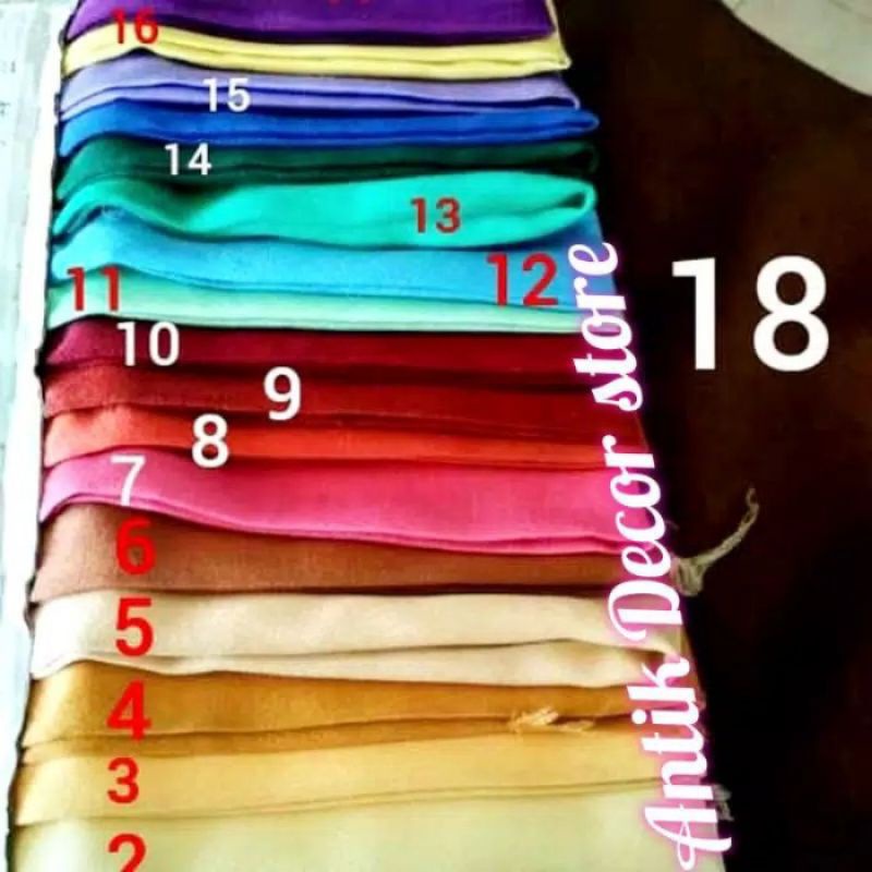 Hitam, Crem, Ping, Biru tua, Biru muda, Coklat tua, Coklat muda, Ungu muda, Hijau muda, Hijau tua, Gold, Merah maroon, Abu tua, Ungu tua, Abu muda, Kuning