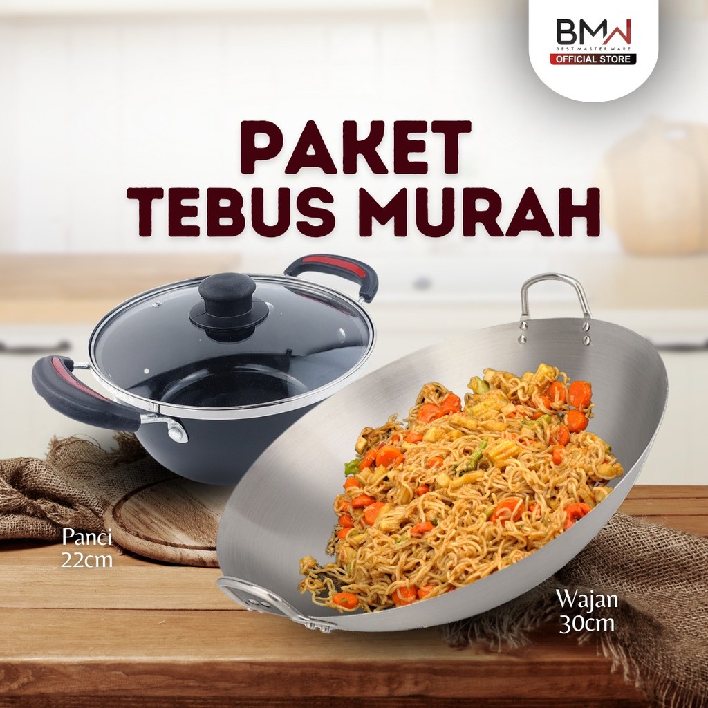 BMW Kitchenware - Paket 1 PCS Wajan Stainless Steel Tebal + 1 PCS Panci Enamel Anti Lengket Bahan Berkualitas Premium