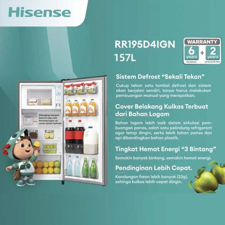KULKAS HISENSE 1 PINTU SATU LEMARI ES PORTABLE KAPASITAS 157L 157 LITER RR195D4IGN SILVER REFRIGERATOR