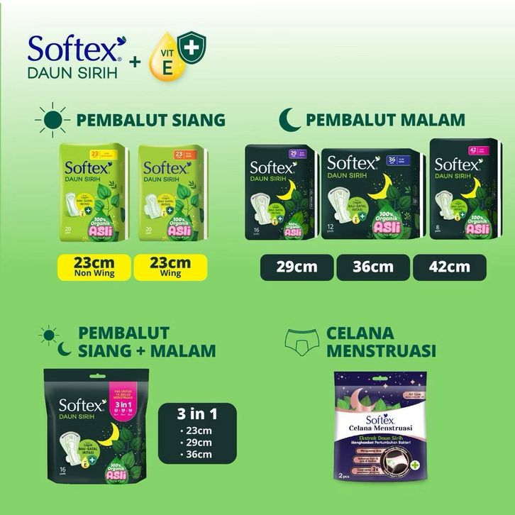 Pembalut Softex Daun Sirih + Vitamin E Non Wing 23Cm 18 Pads / Pantyliner Longer & Wider 30 pads / 20pads / 15cm 44s / J