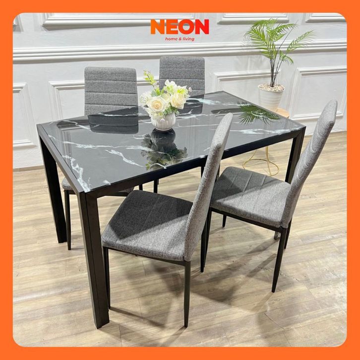 NEON Meja Makan Alvian | Meja Makan Kaca 4 Kursi Rangka Besi Motif Marmer Minimalis | Dining Table