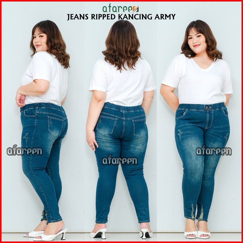 Afareen - Celana Jeans Sobek Wanita Jumbo Wisker Jeans Ripped Button Jeans Pinggang Karet 35-43